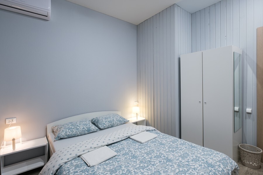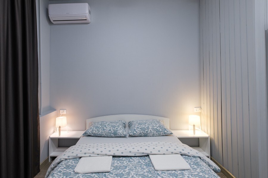 Двуспальная кровать. Шкаф для вещей. Зеркало. Прикроватные тумбы со светильниками. Кондиционер. Просторный балкон. Сушилка для белья. Ковролин. Полотенца.