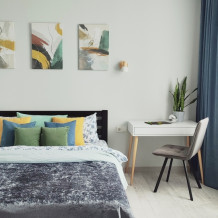 Мебель: кровать с ортопедическим матрасом, диван-кровать, консольный столик, обеденная зона на 4 человек, большая гардеробная зона в прихожей для хранения вещей.