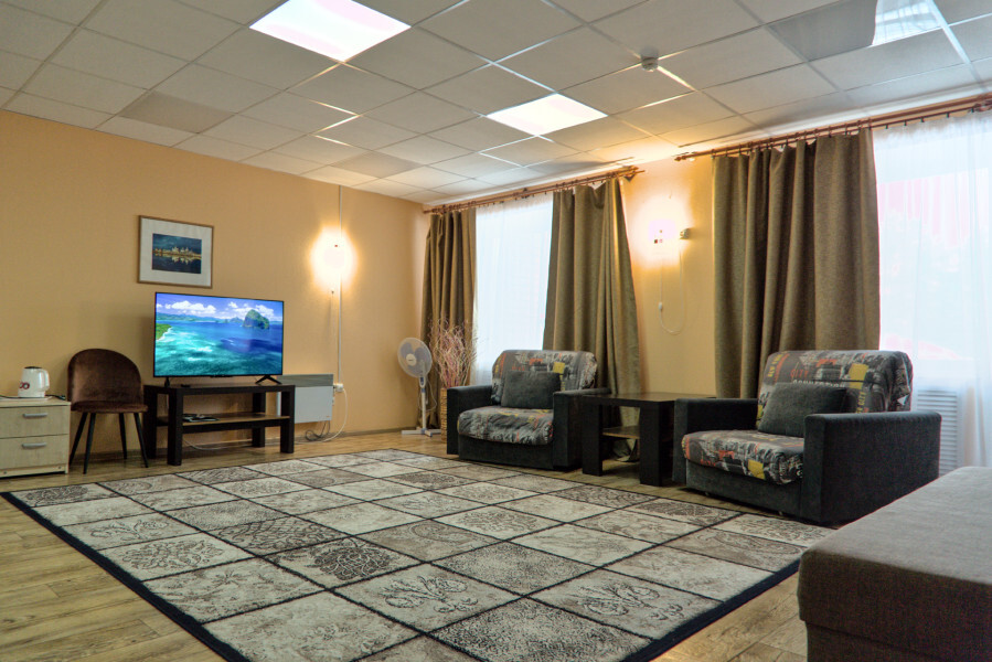 В номере имеется: мягкая мебель (кресло-кровать 2 штуки, раскладной двуспальный спальный диван), детская кроватка, детский уголок, холодильник, ТВ, WI-FI, электрический чайник, набор посуды, фен.