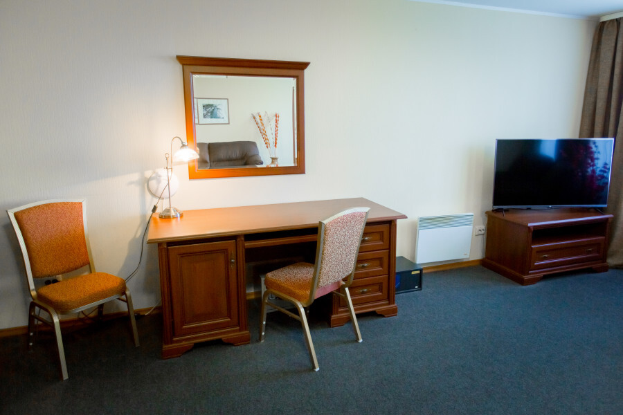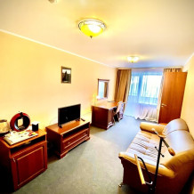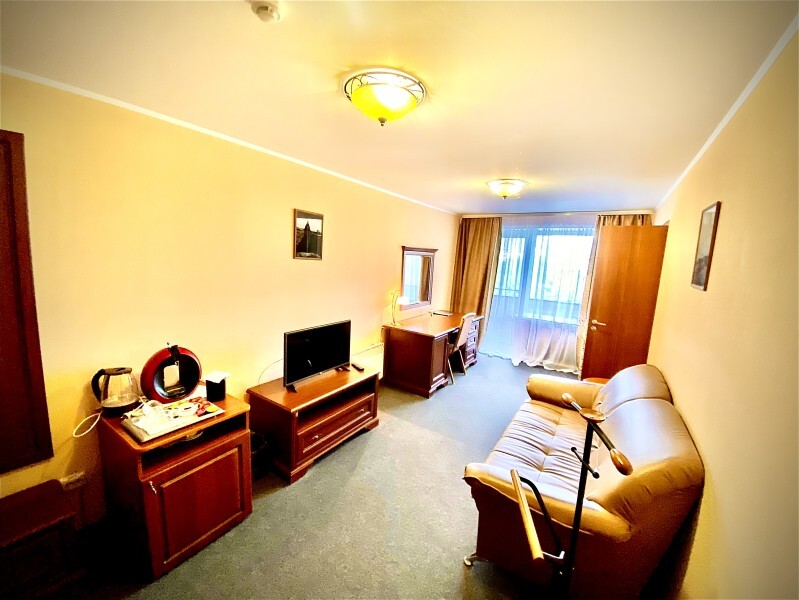 В номере имеется: мягкая мебель (раскладной 2-спальный диван), рабочий письменный стол, холодильник, ТВ, WI-FI, кофеварка, электрический чайник, набор посуды, фен.