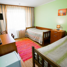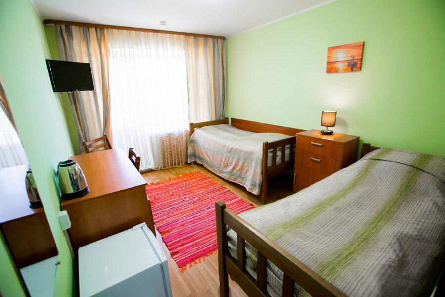 В номере имеется: 2 односпальные кровати, рабочий стол, холодильник, wi-fi, фен, чайник, посуда.