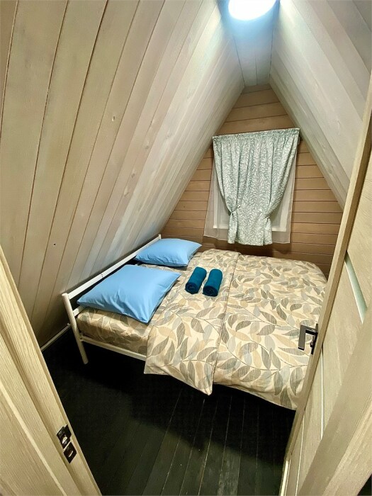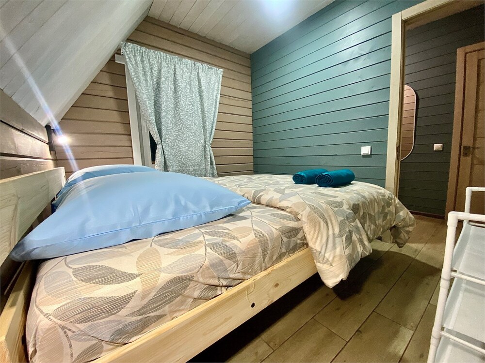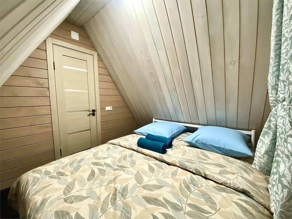 Уютный дом в стиле А-фрейм, 65 м2 с тремя изолированными спальнями в современном исполнении. Входит в состав комплекса Избушки guestHouse.
