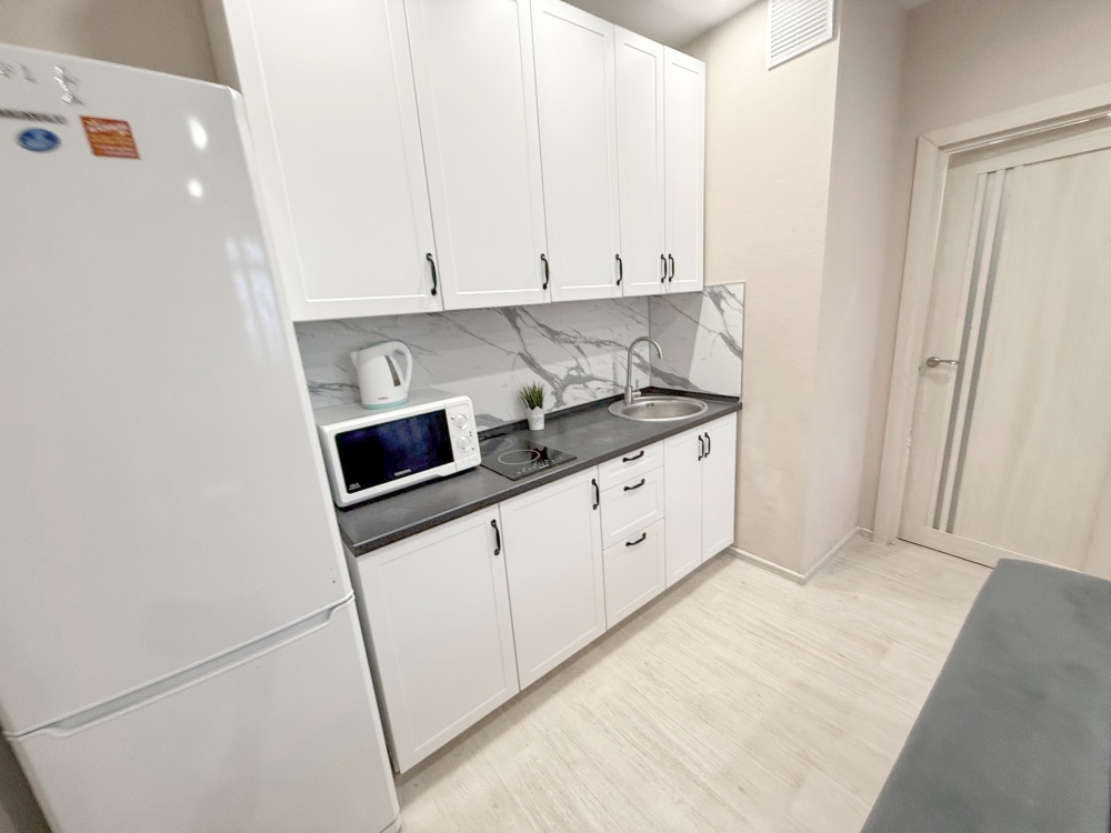 Кухня полностью оборудована: холодильник, микроволновая печь, посуда.