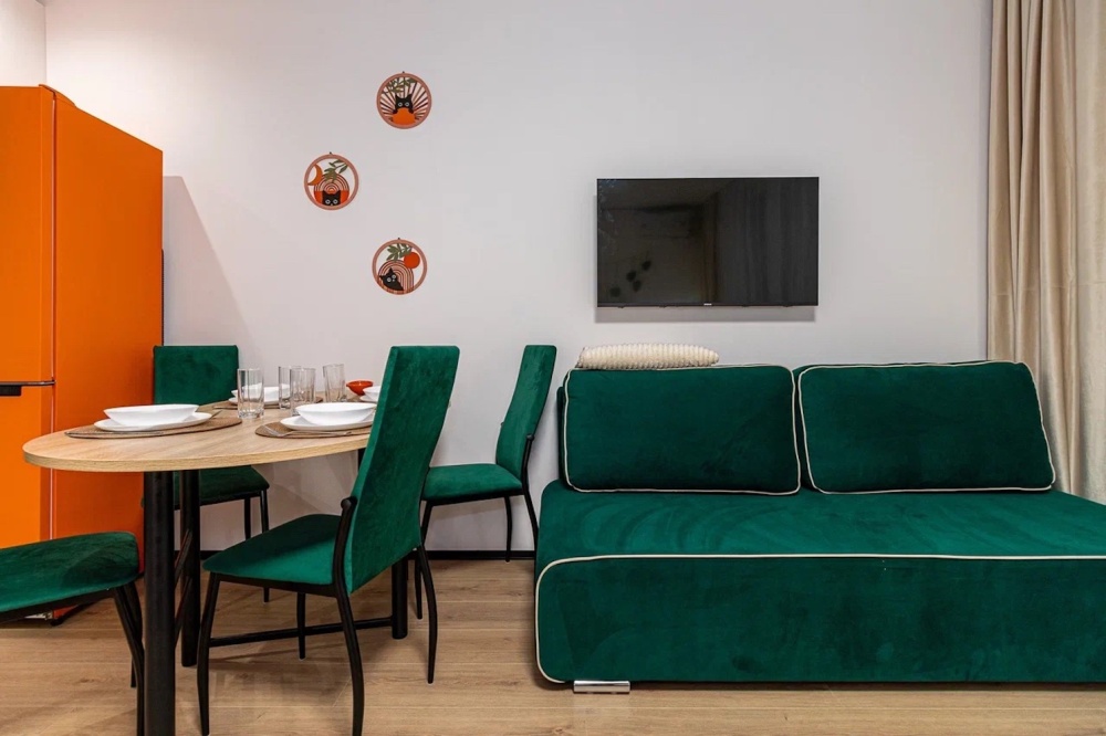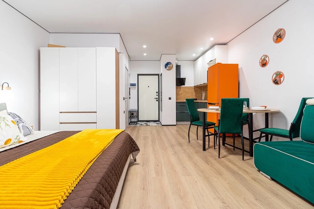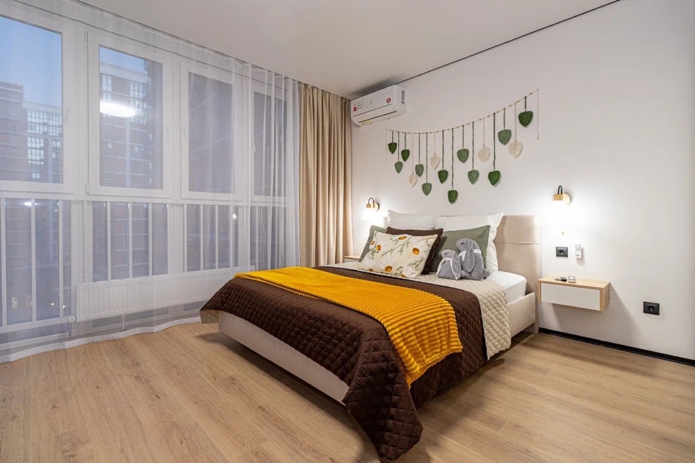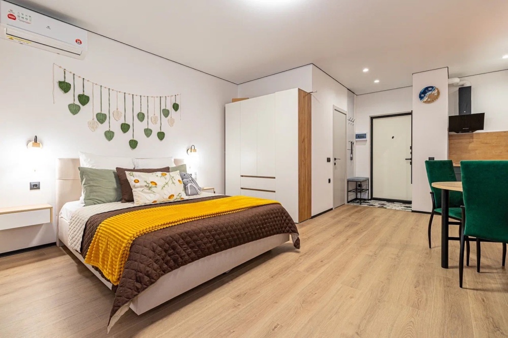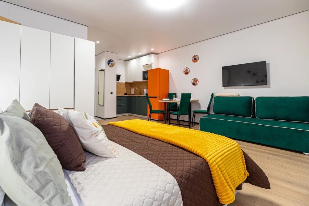 Уютная домашняя обстановка, полностью оборудованные кухня, ванная и спальня.
