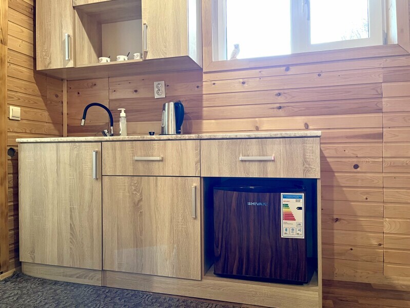 Гостиная зона: мини-кухня с холодильником, микроволновкой, электрическим чайником и необходимой посудой.