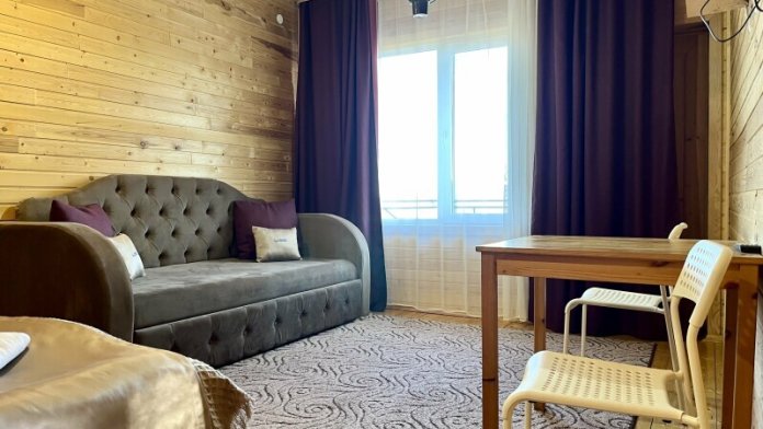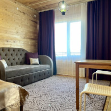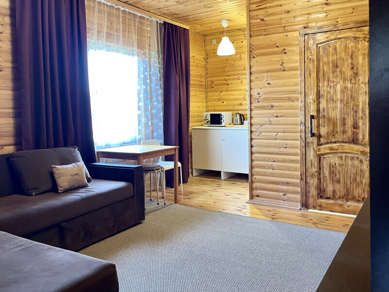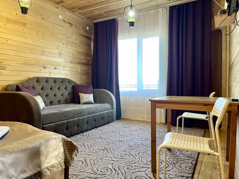 Уютная комната на 3-х человек. Комната оснащена двухспальной кроватью в спальне и диваном в гостиной зоне. В распоряжении гостей — индивидуальная ванная комната с косметическими принадлежностями, феном, телевизором, чайником и необходимой мебелью. Комната подходит для размещения от 2 до 3 человек.