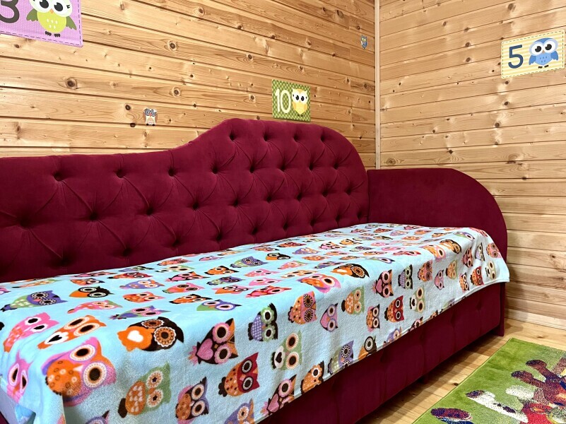 Гостиная зона включает диван и отдельную детскую зону с односпальной кроватью — удобно для ребёнка или дополнительного гостя.