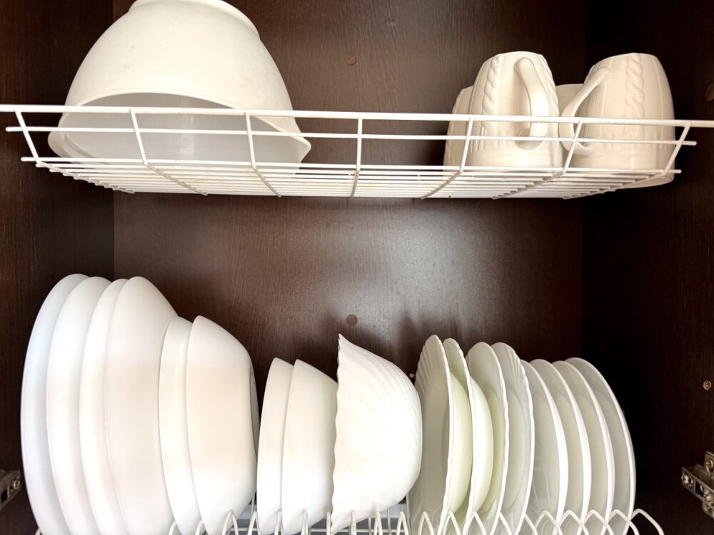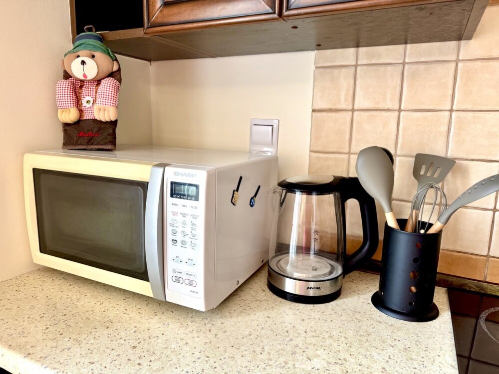 На кухне Вы найдете все необходимое для приготовления еды: посуда, столовые приборы, кастрюли и сковородки, микроволновка, холодильник, чайник, духовка и плита.