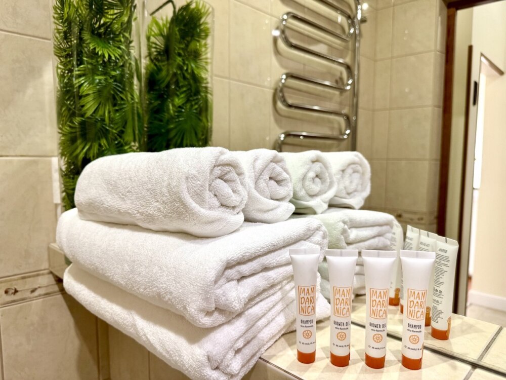 Для каждого гостя подготовлено по 2 полотенца (для душа и рук) и 1 полотенце для ног.