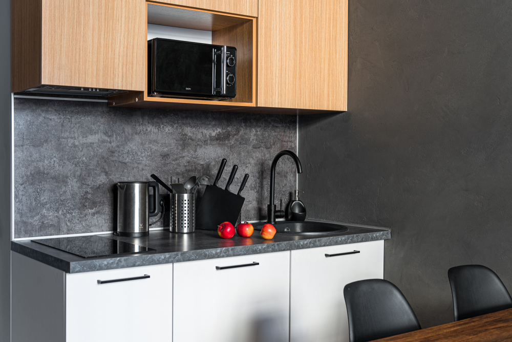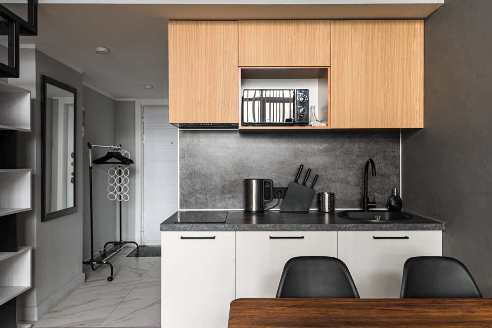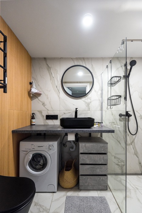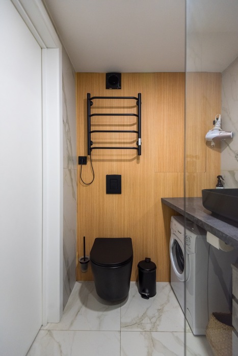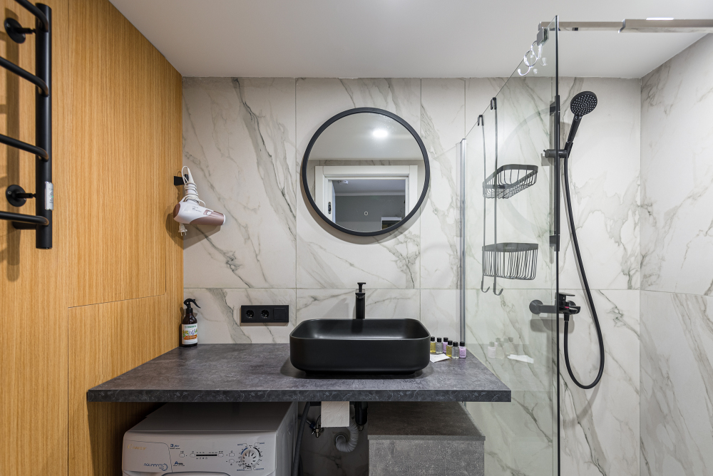- Стильный интерьер, двуспальная кровать (double), мини-кухня, современная ванная с душем и стиральной машиной.