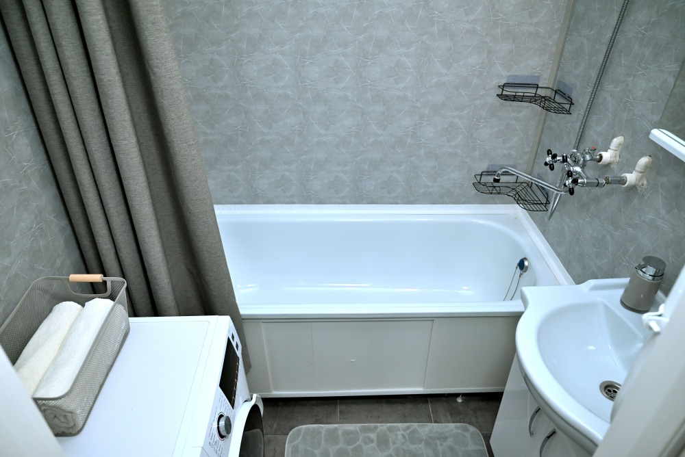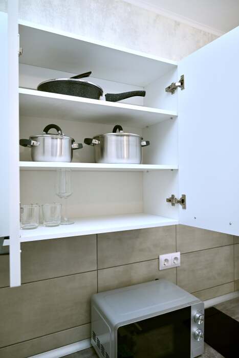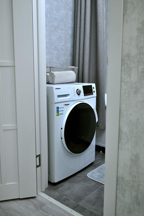 - оборудованная кухня (холодильник, печь СВЧ, электрочайник, посуда, приборы, стиральная машина);