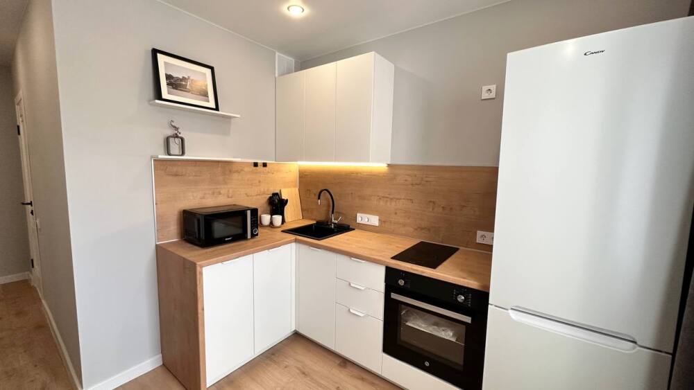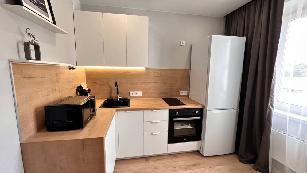 - Оборудованная кухня (холодильник, печь СВЧ, электрочайник, посуда, приборы, стиральная машина);