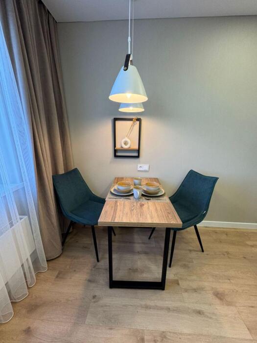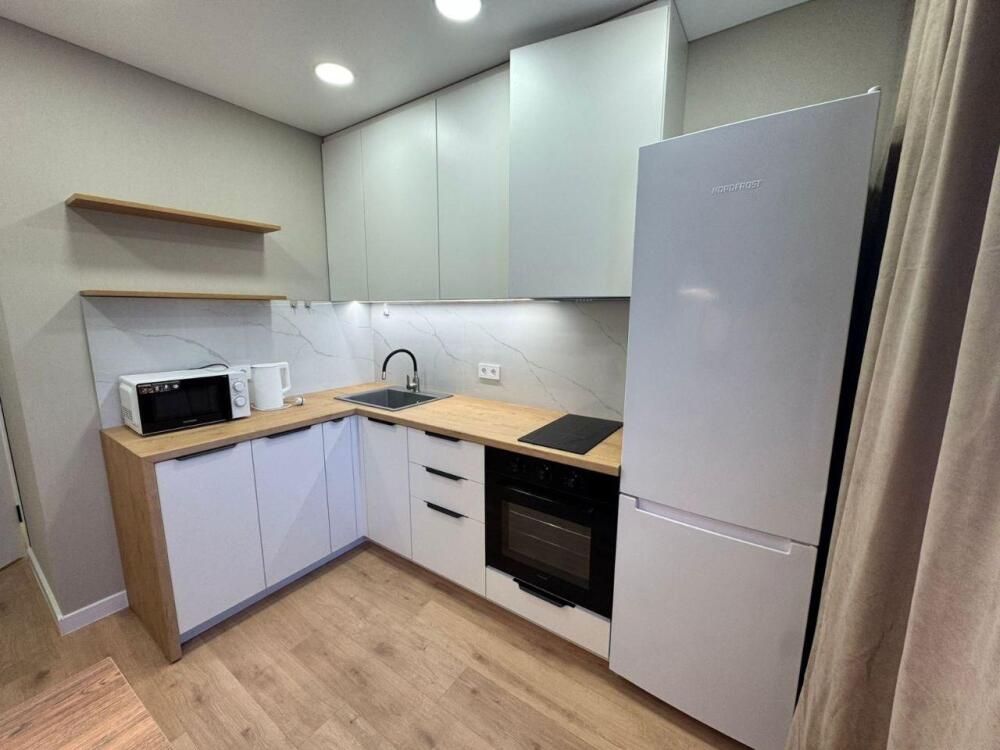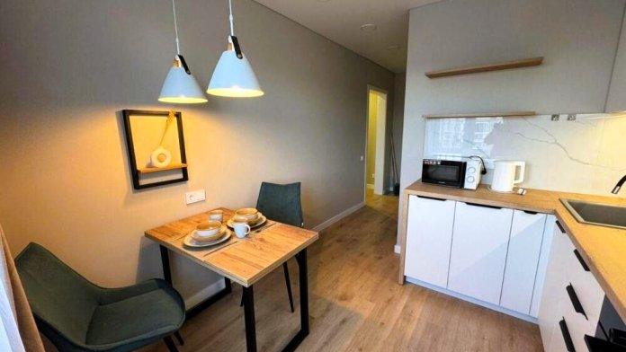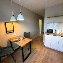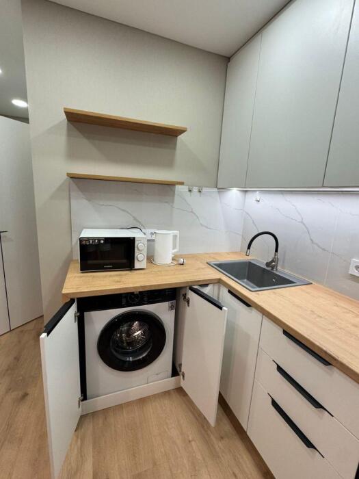 - Оборудованная кухня (холодильник, печь СВЧ, электрочайник, посуда, приборы, стиральная машина);