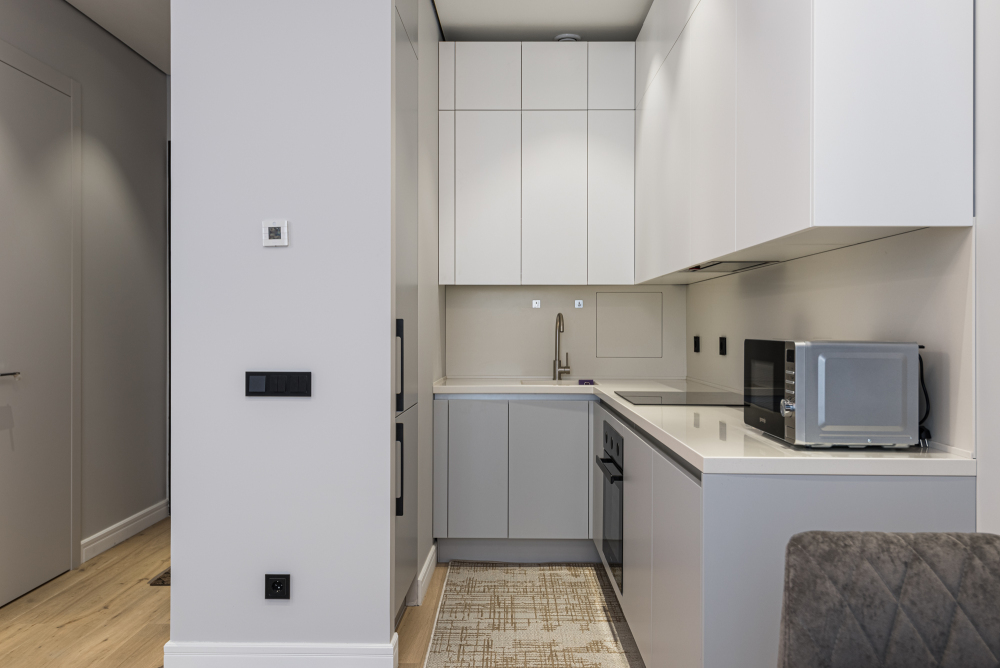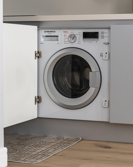 - Полностью оборудованная кухня (варочная панель, холодильник, посуда, чайник).
