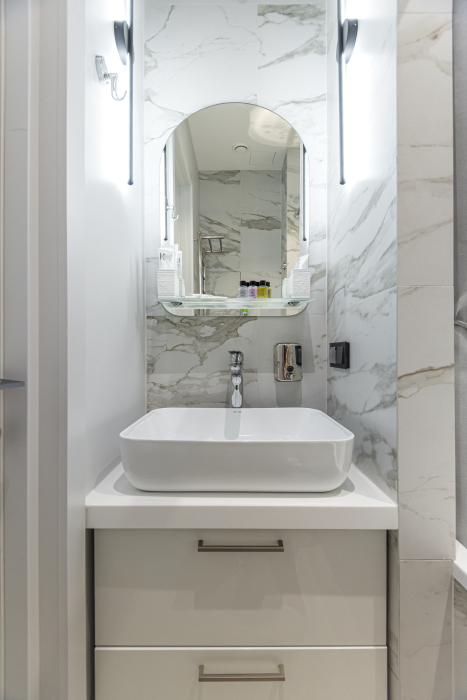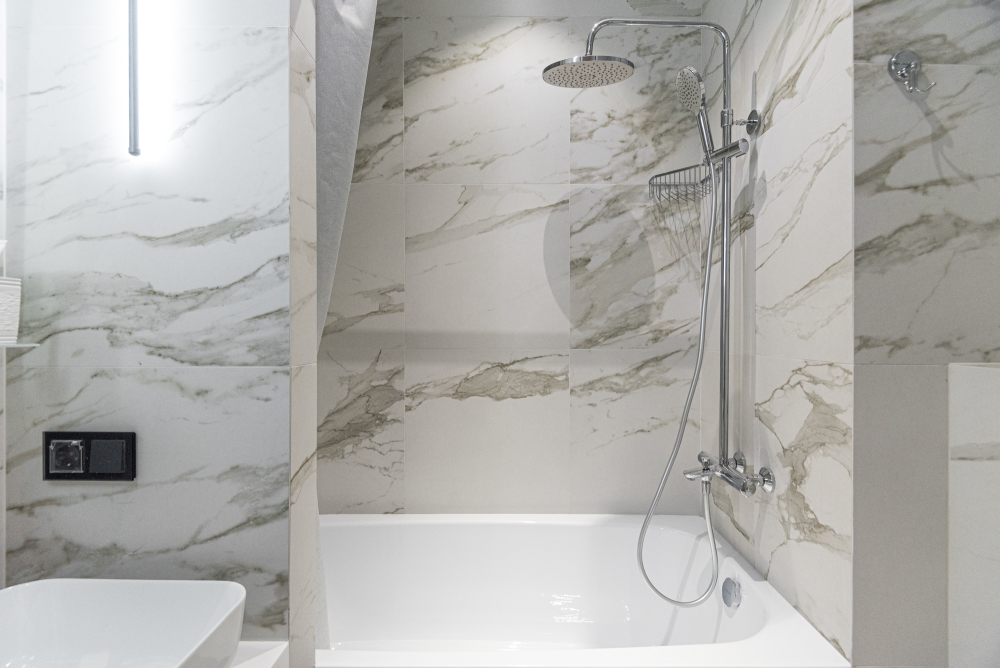 - Стильная ванная с мраморными элементами и тропическим душем.