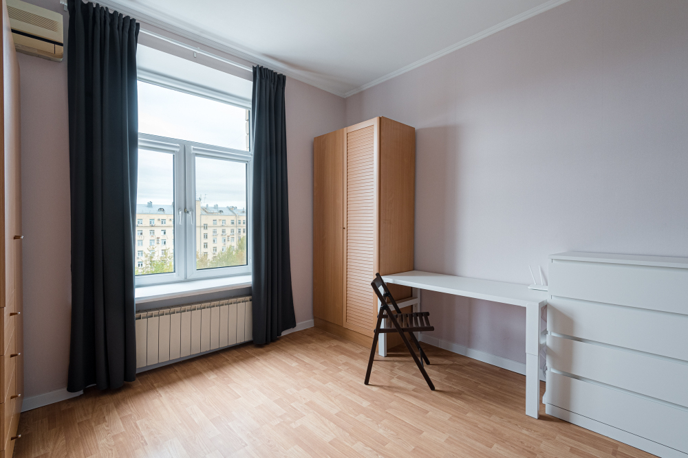 - Просторная спальня с двуспальной кроватью (double), рабочим местом, вместительными шкафами. Дополнительное спальное место на диване в кухне.