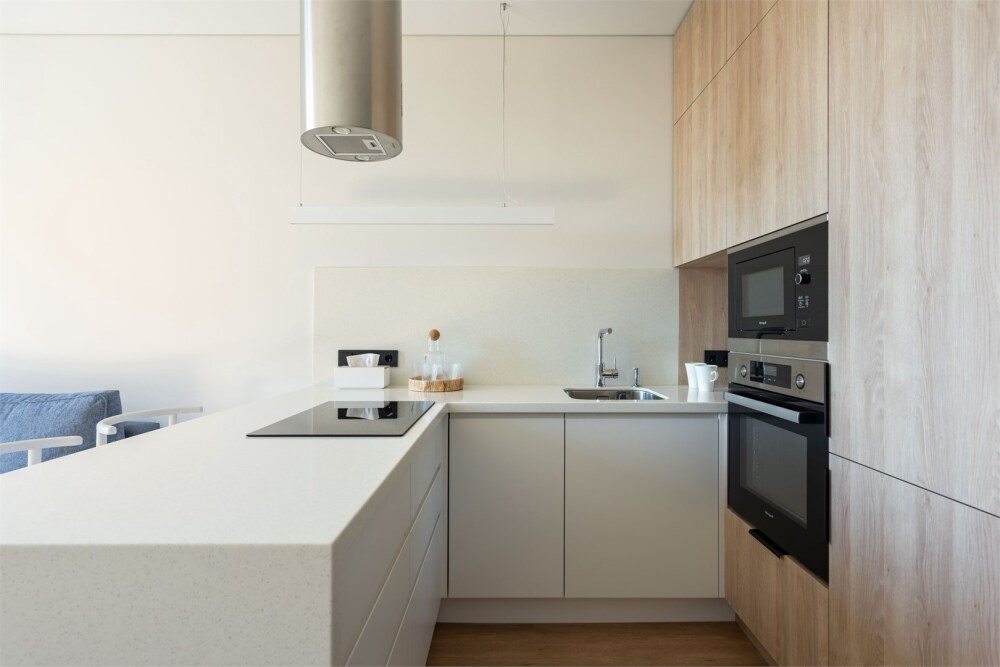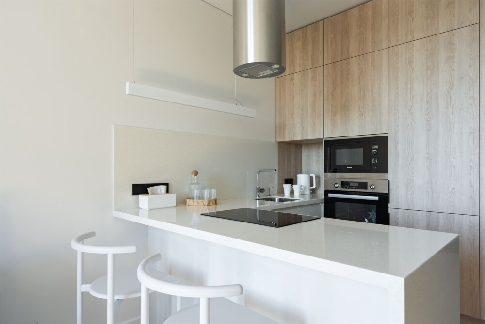 - Кухня: индукционная плита, духовка, микроволновая печь, чайник, холодильник, стиральная и сушильная машина.