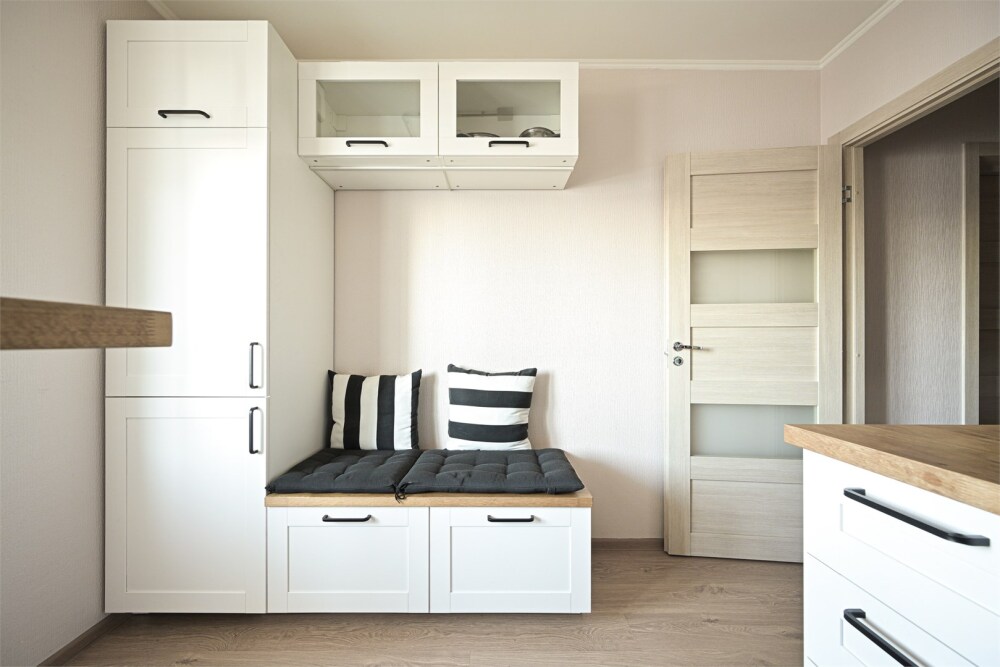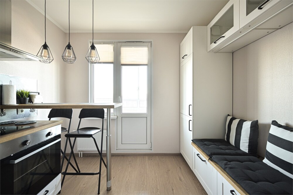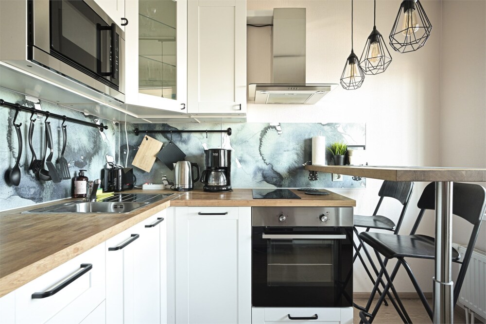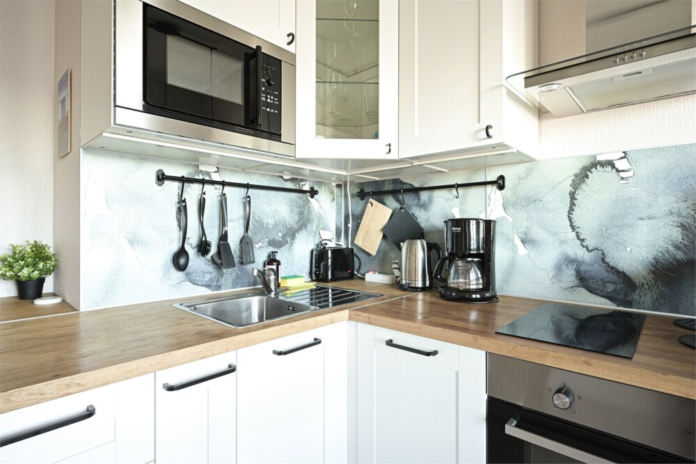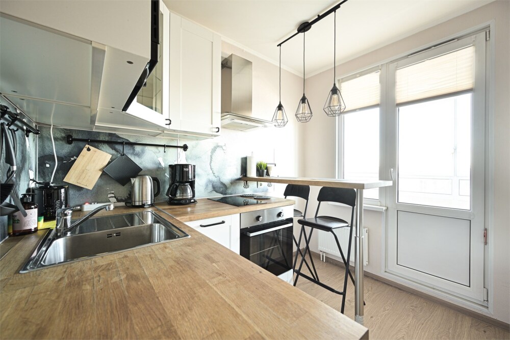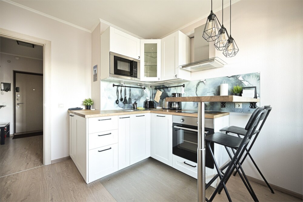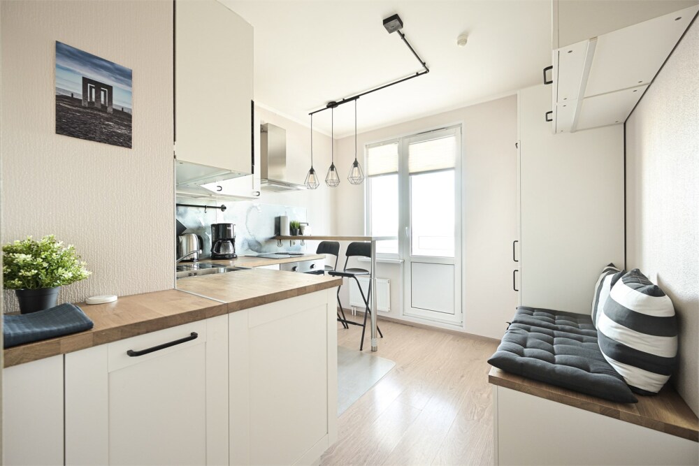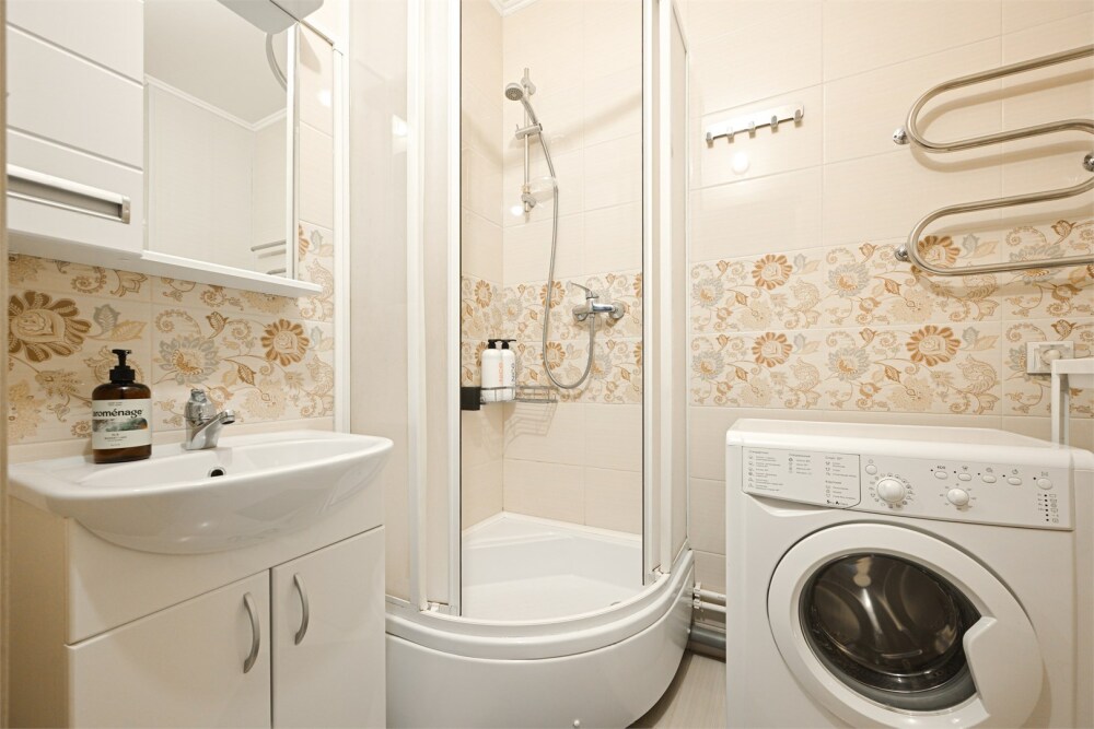 - Кухня: индукционная плита, чайник и кофе-машина, холодильник, стиральная машина.