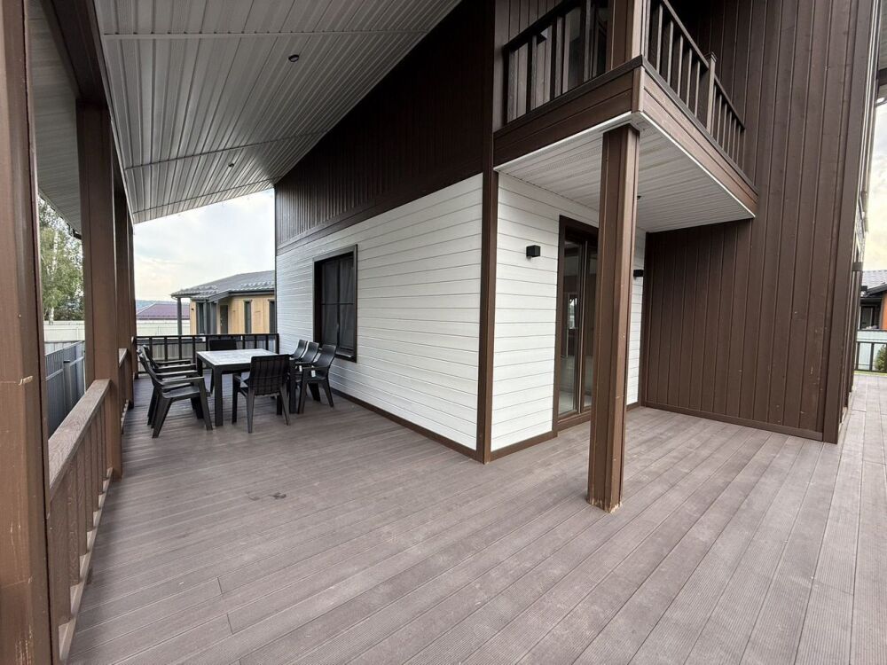 - Просторная терраса на первом этаже с выходом из кухни-гостиной — идеальное место для утреннего кофе или вечерних посиделок с друзьями.