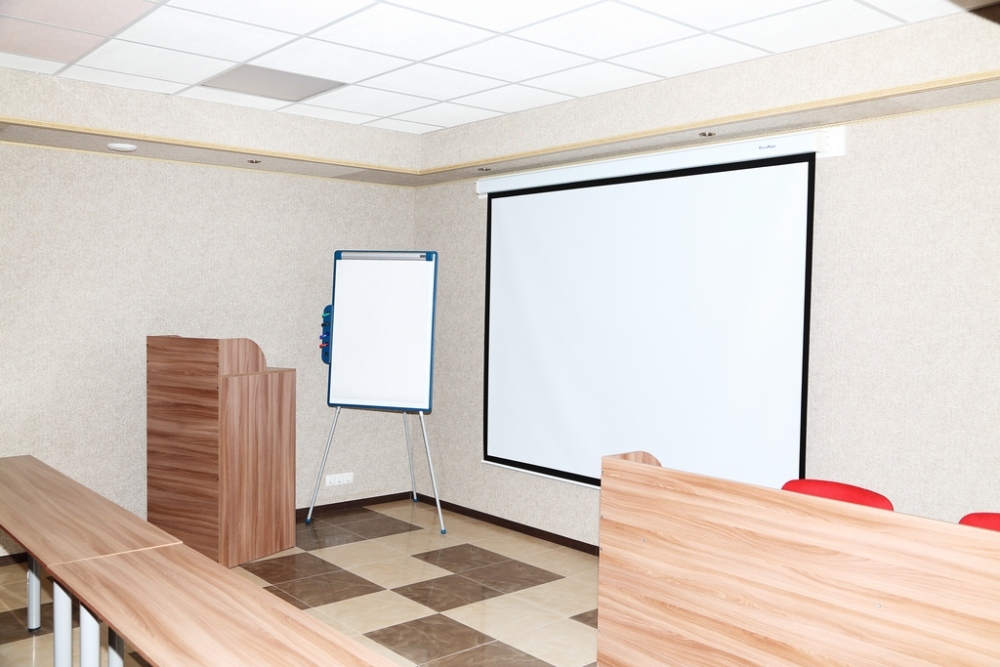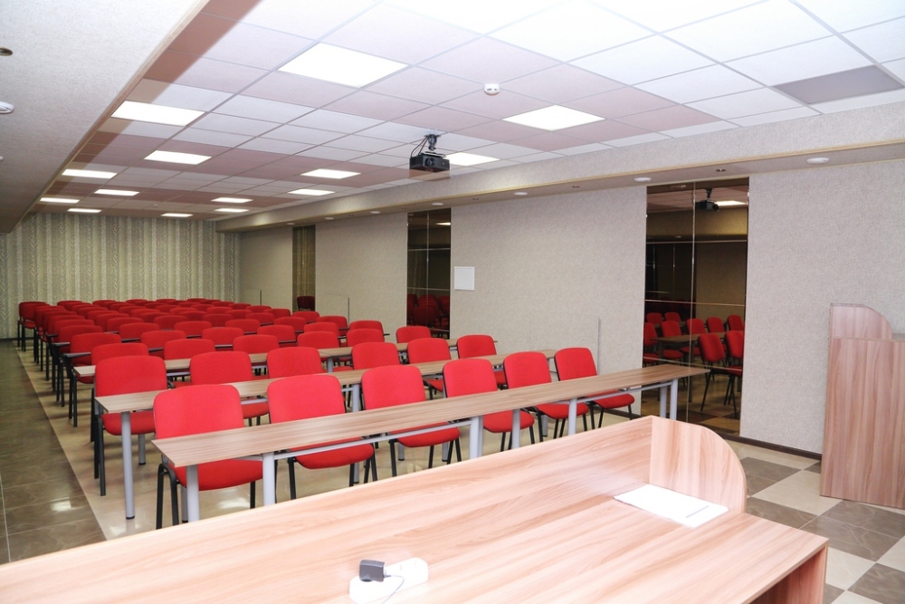 - Конференц-зал (90м2, до 100 человек): мягкие кресла с пюпитрами, система вентиляции и кондиционирования, проектор, ноутбук, «флип-чарт», лазерная указка, микрофоны, Wi-Fi (все оборудование включено в стоимость аренды;