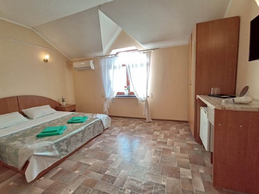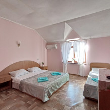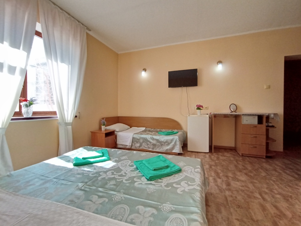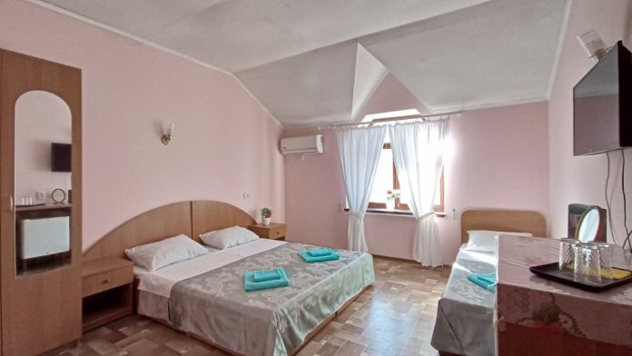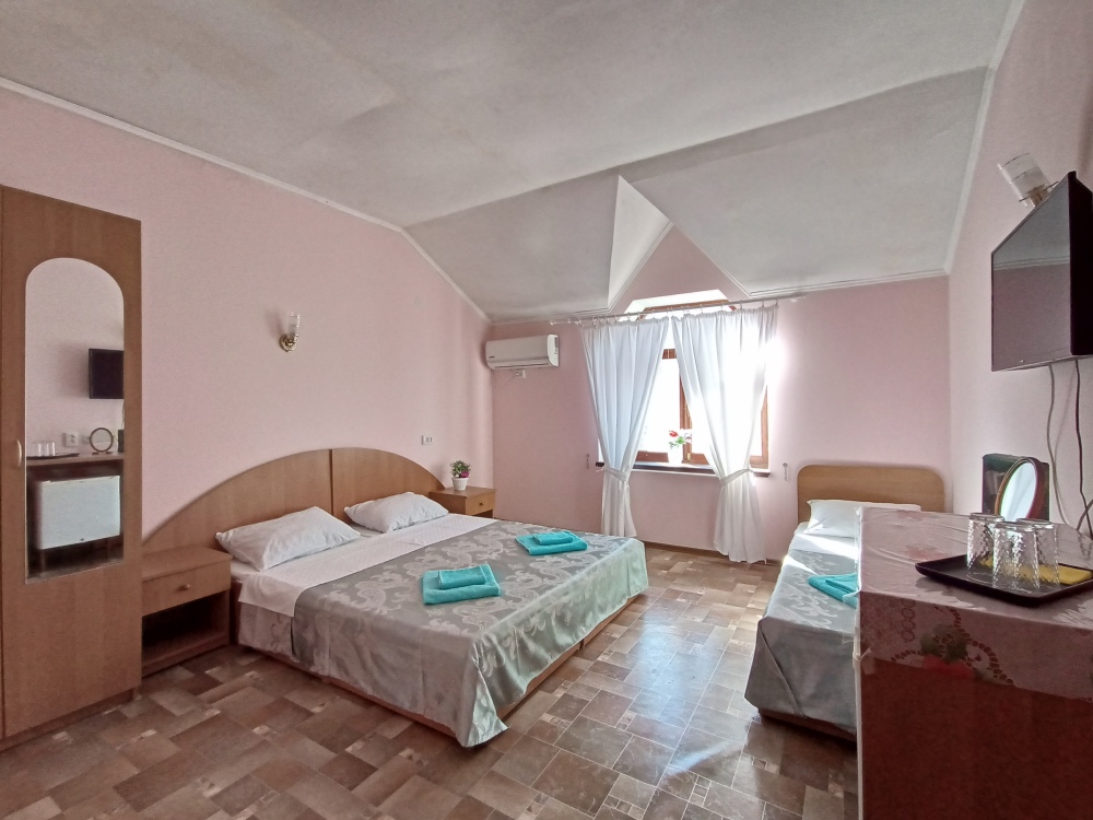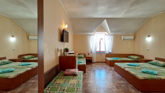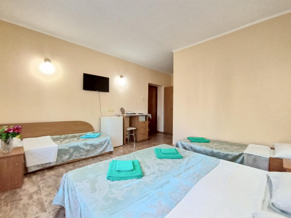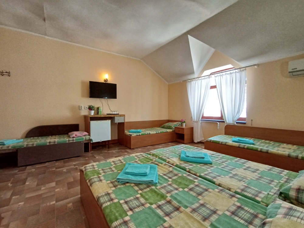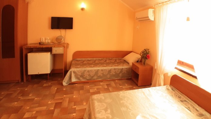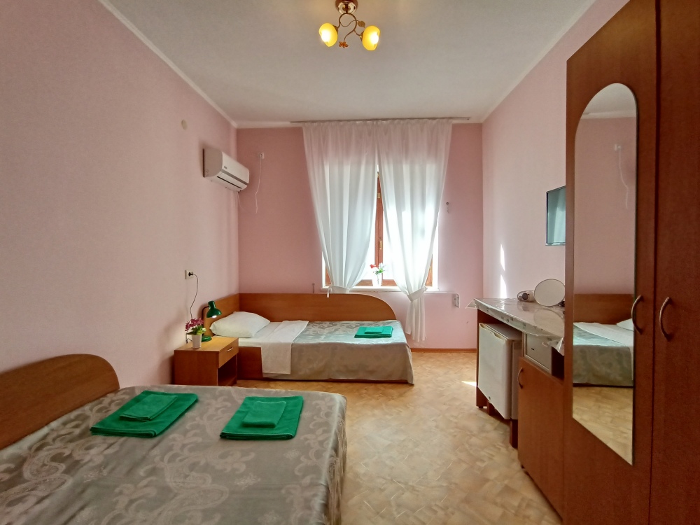 Гостевой дом находится в поселке Береговое (7 км. от Феодосии). Наши гости размещаются в, двух, трёх, четырёхместных однокомнатных, и трёх, четырёх, пяти и шестиместных двухкомнатных номерах. В каждом номере имеется сан. узел (душ, туалет, умывальник), кондиционер, холодильник, телевизор, индивидуальный гостиничный сейф, напольный вентилятор, фен. На окнах москитные сетки. Горячая и холодная вода – подаются круглосуточно. Бесплатный доступ к интернету (WI - FI).