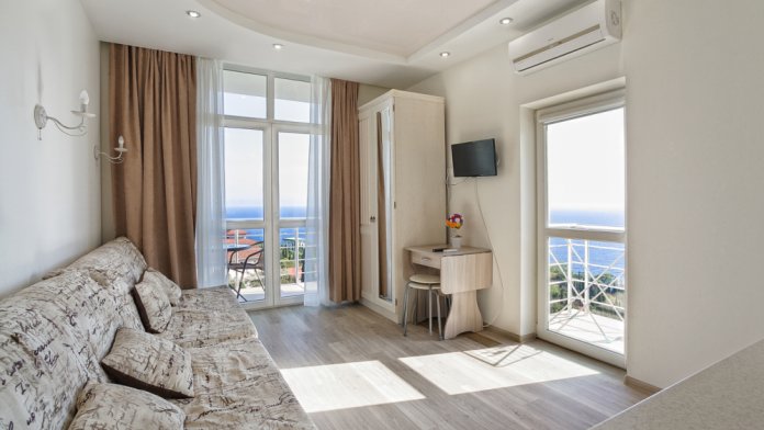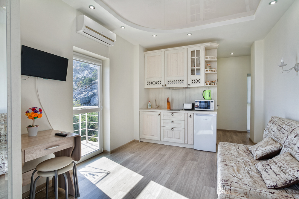 Квартира на втором этаже. Включает в себя: кухня-студио, двухспальный диван, два кресла-кровати, санузел с душевой кабиной, фен, шкаф - купе, ТВ и Wi-Fi, посуда, электрочайник, 2-комфорочная плита, кондиционер, холодильник, микроволновка, посуда, постель, полотенце, утюг, панорамное остекление с видом на море, гору Ай -Петри и скалу Дива.