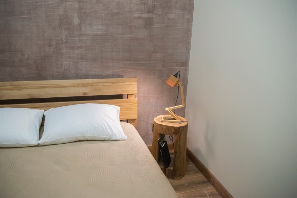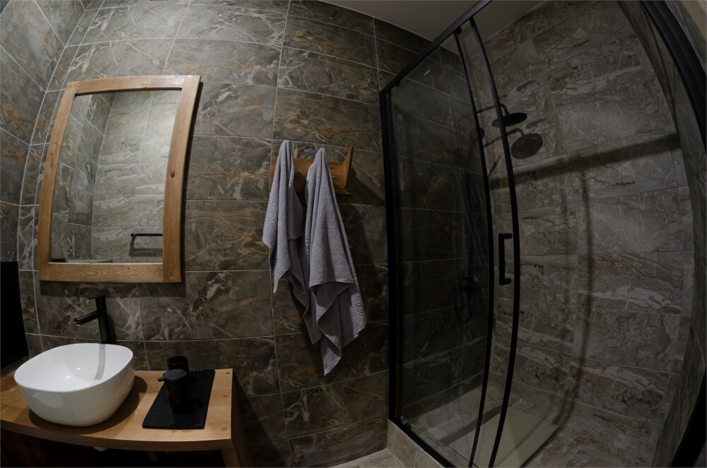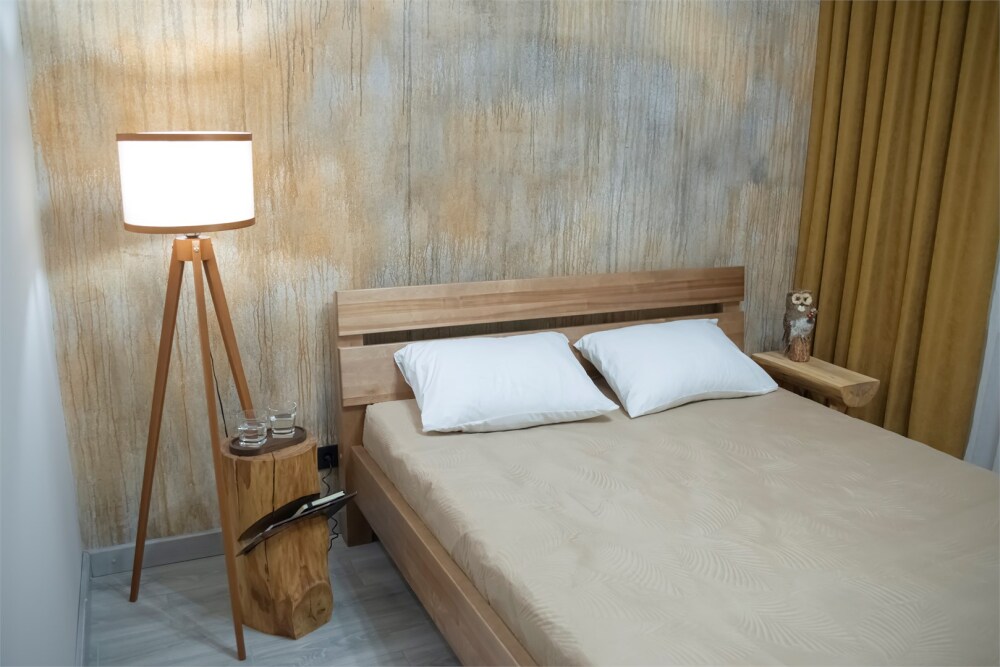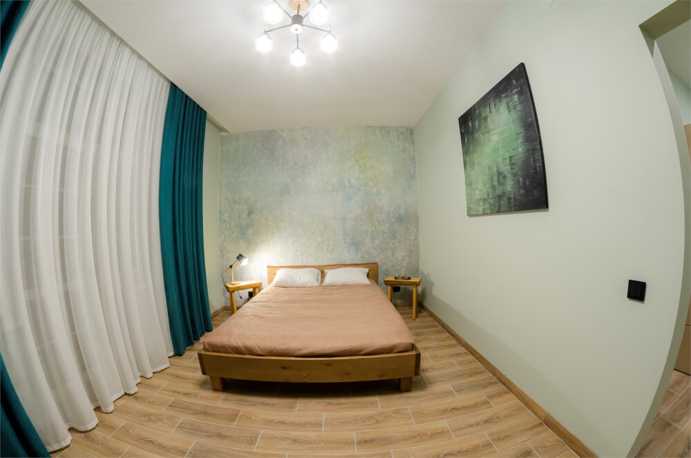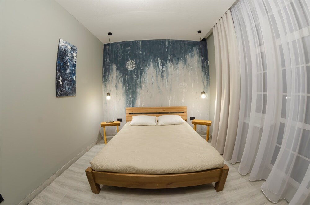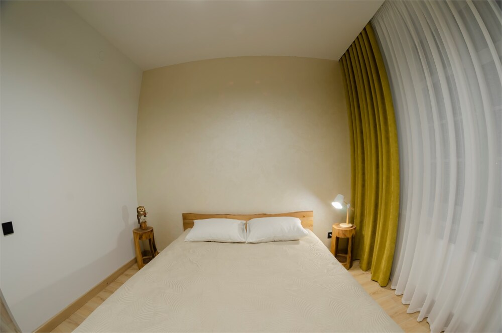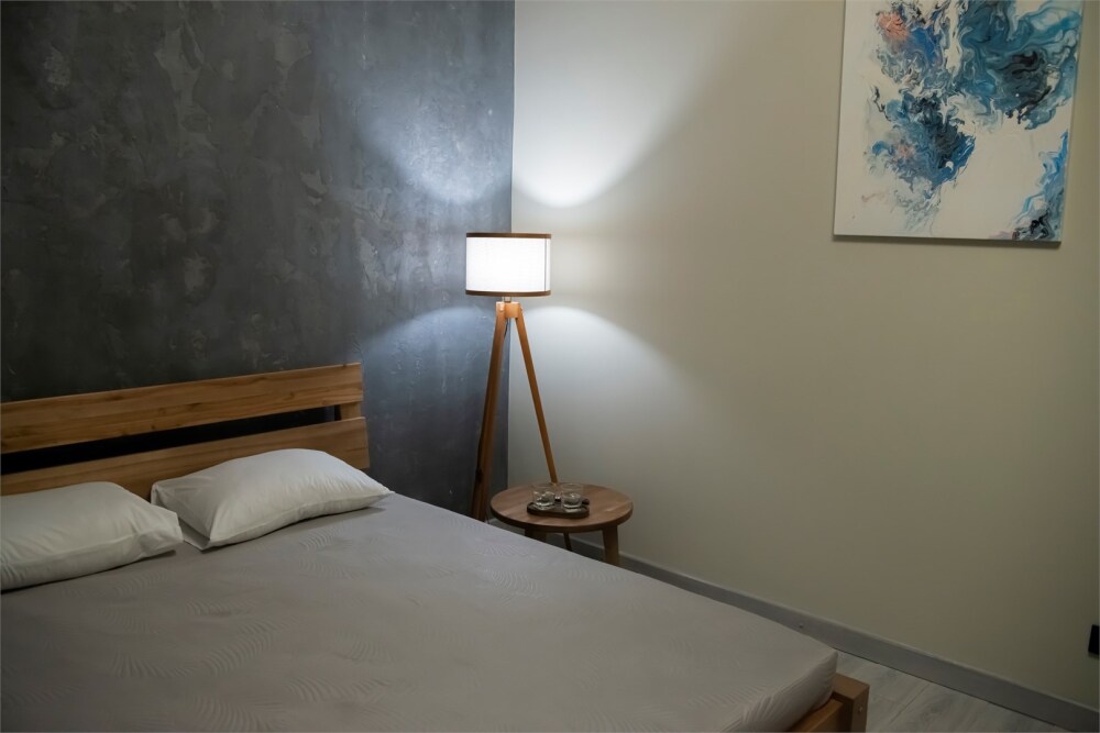 Спальня оборудована двуспальной кроватью с ортопедическим матрасом и зоной для хранения вещей. Ванная комната имеет душ, раковину, туалет, а также фен, полотенца.