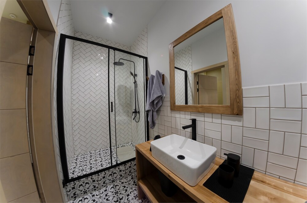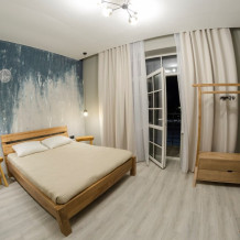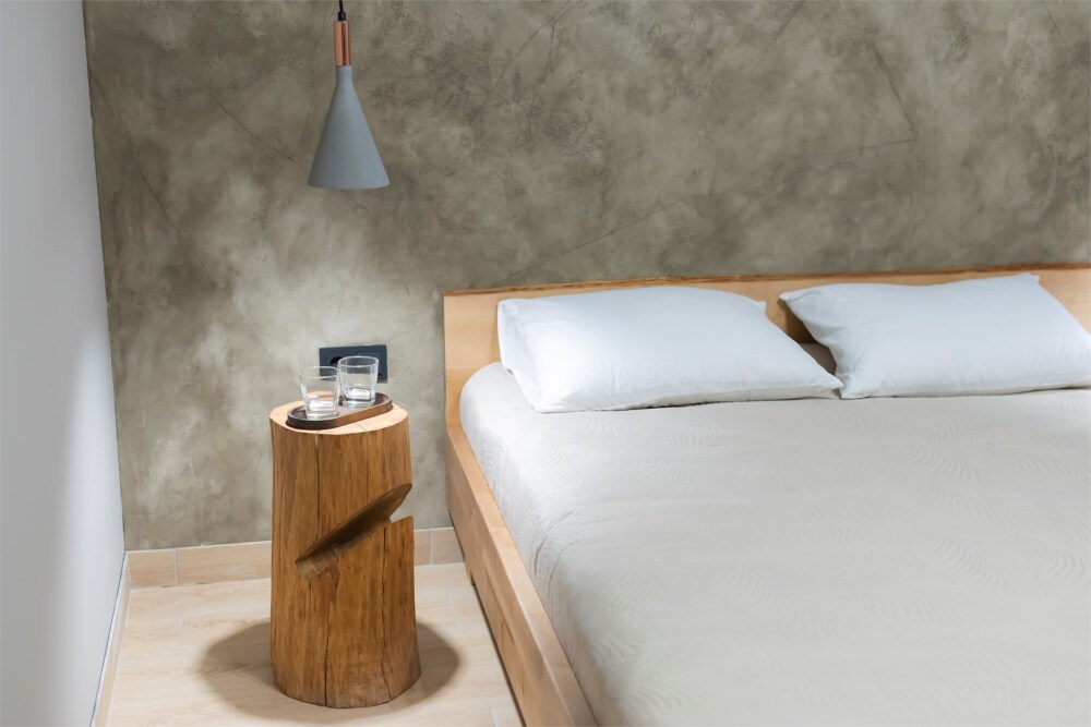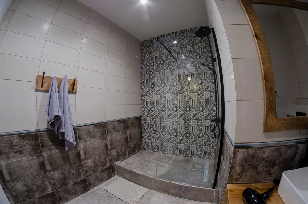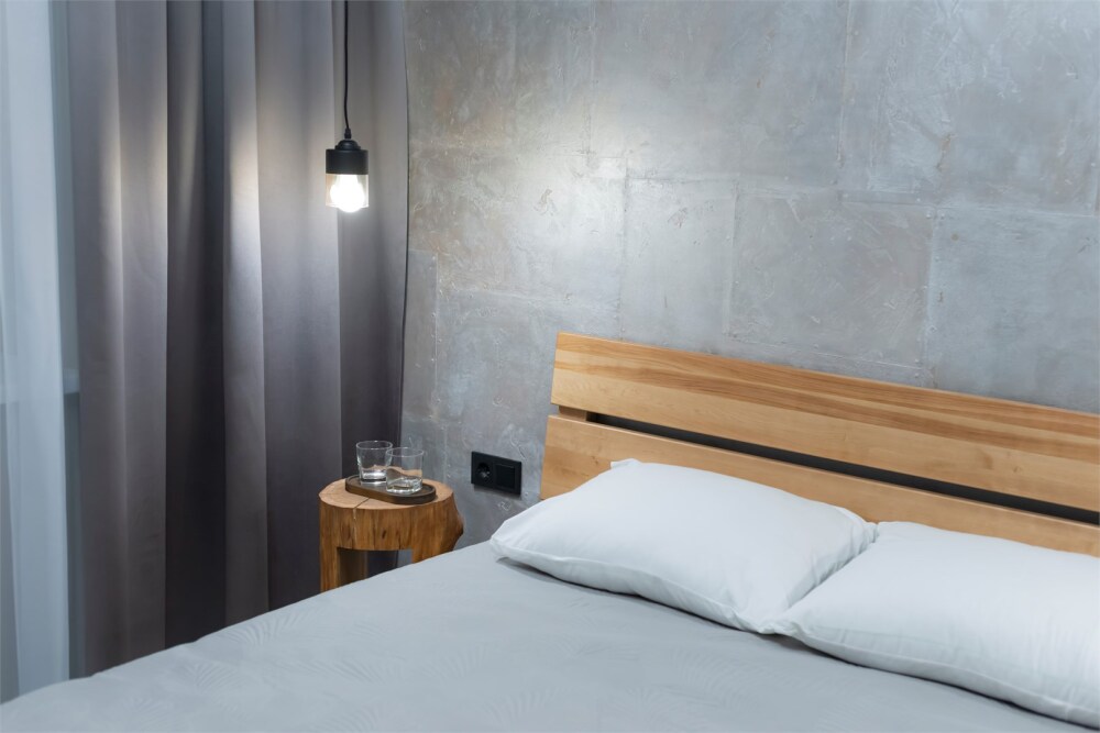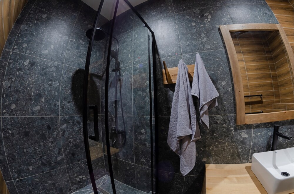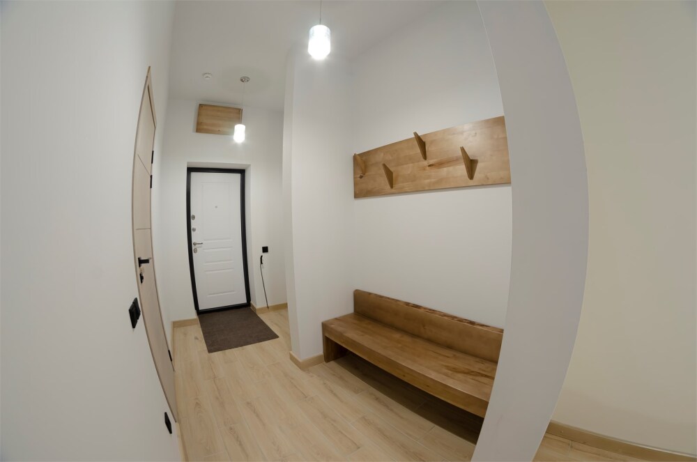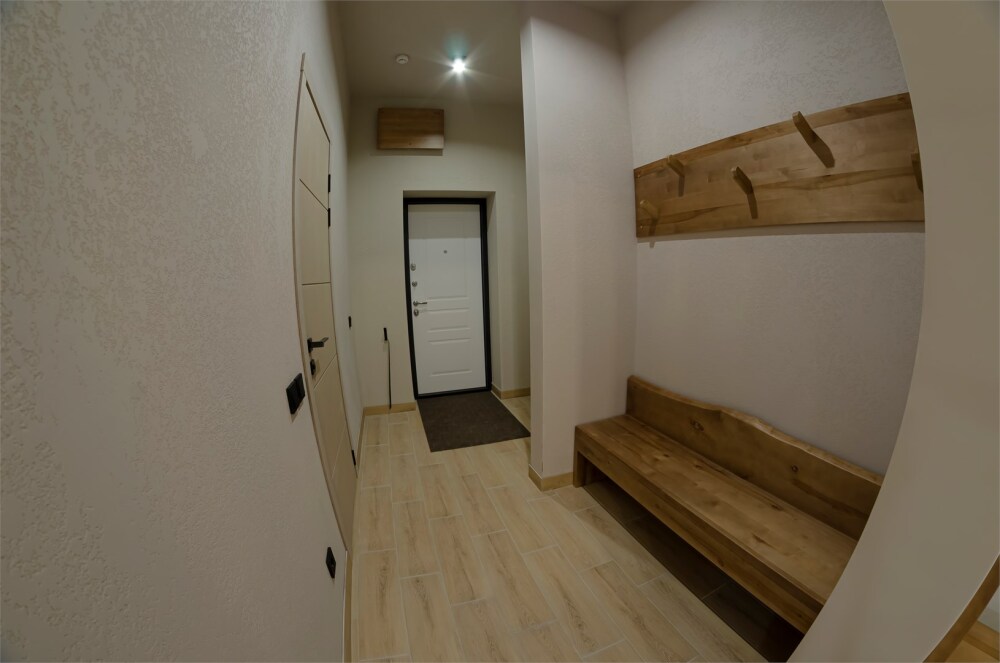 Спальня оборудована двуспальной кроватью с ортопедическим матрасом и зоной для хранения вещей. Ванная комната имеет душ, раковину, туалет, а также фен, полотенца.