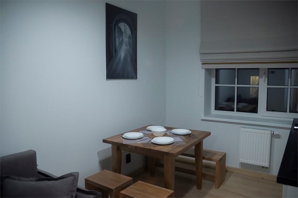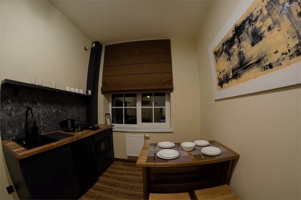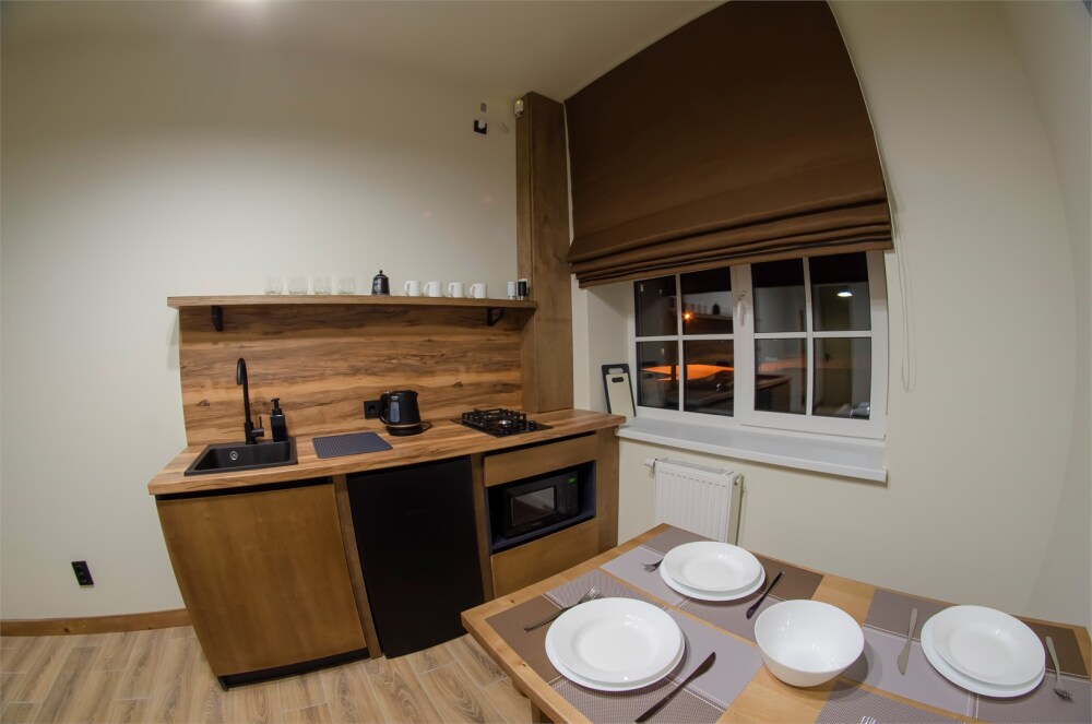 Кухня оснащена всем необходимым для приготовления пищи: холодильником, микроволновой печью, электрическим чайником и посудой. Также в номере есть уютная гостиная с раскладным диваном с шириной спального места 1200 мм., где Вы сможете отдохнуть после долгого дня.