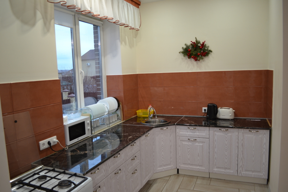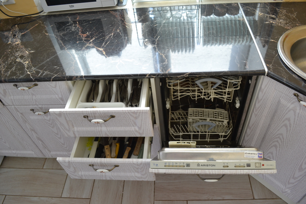 - все необходимые столовые приборы и посуда (принимаются и сдаются в чистом виде). На кухне есть посудомоечная машина, газовая плита, холодильник, микроволновка, электрочайник, тостер;