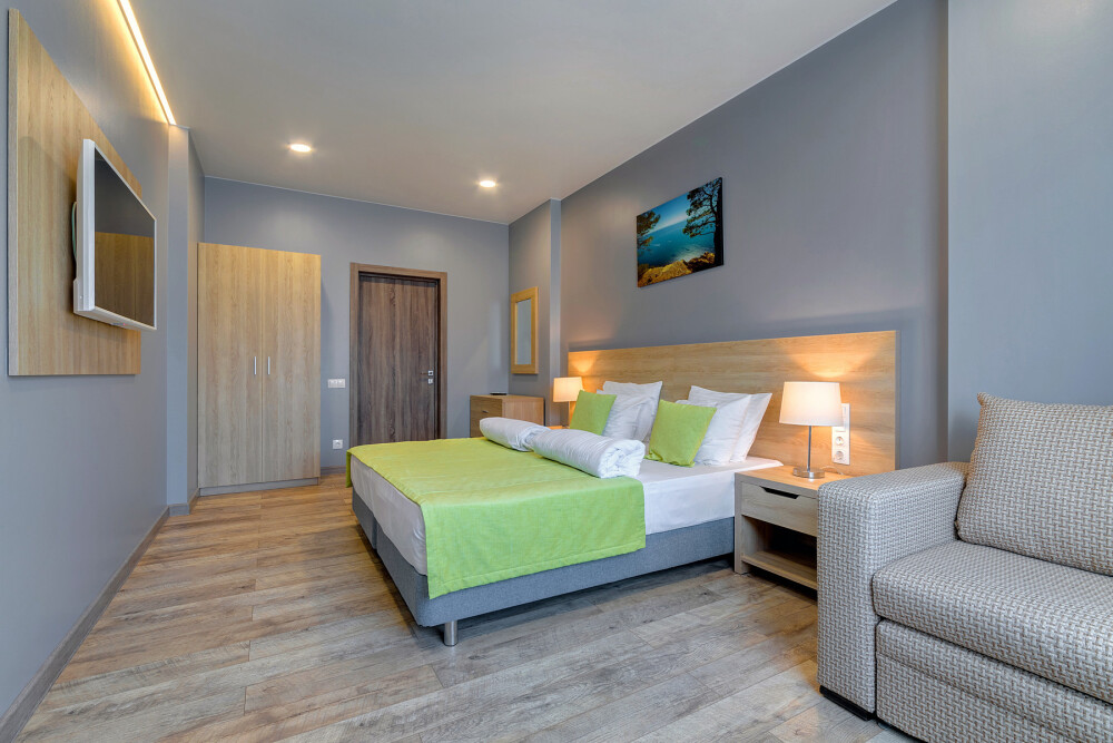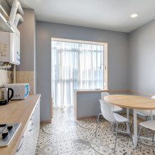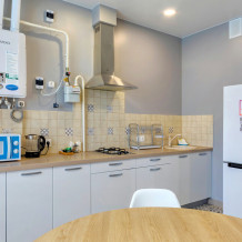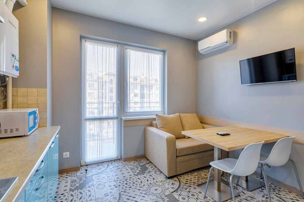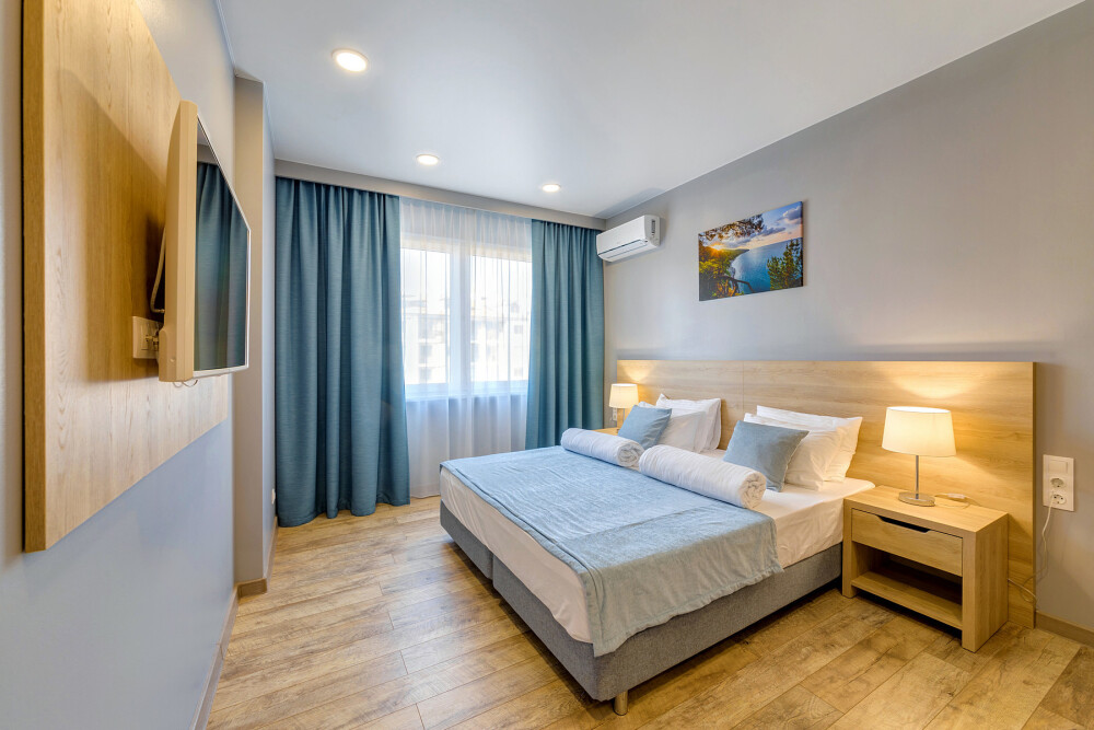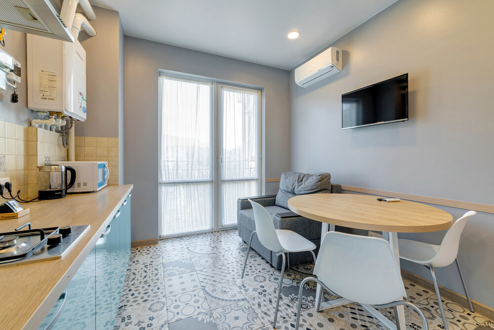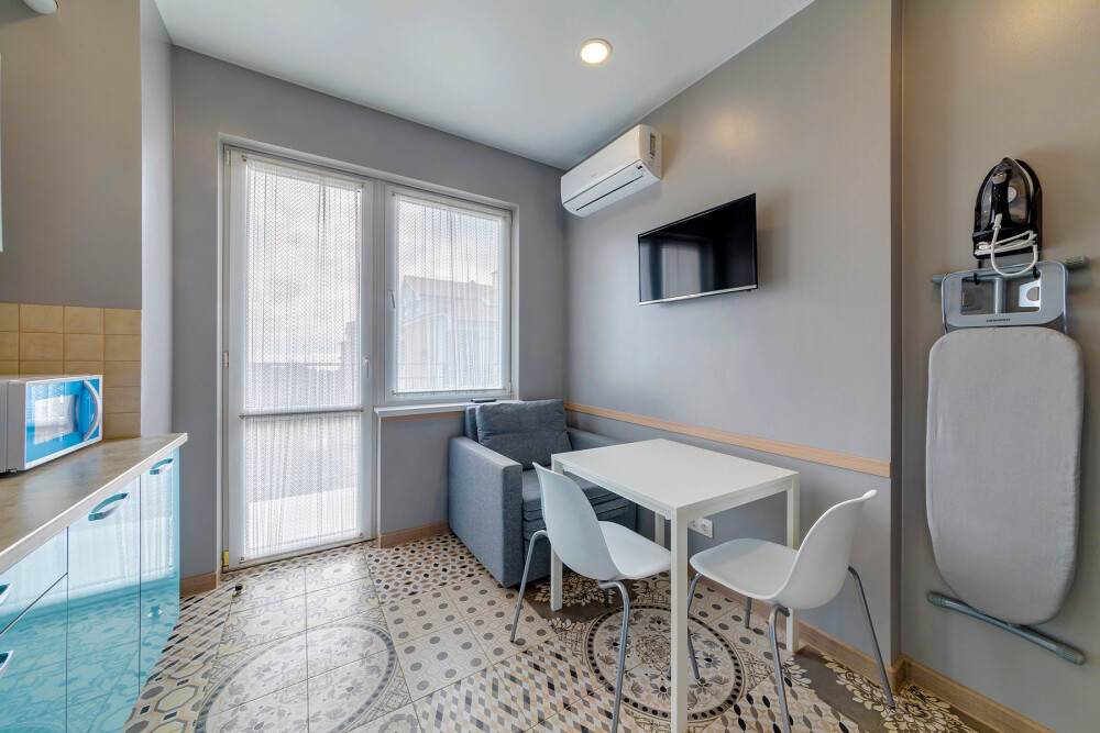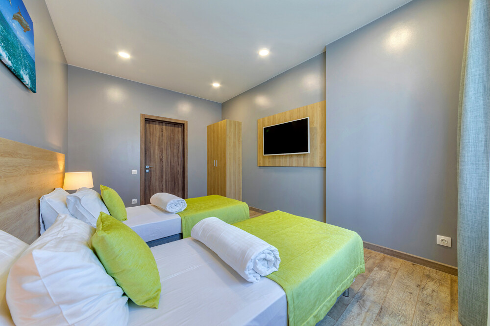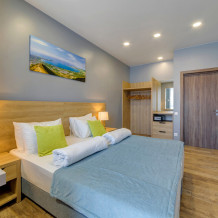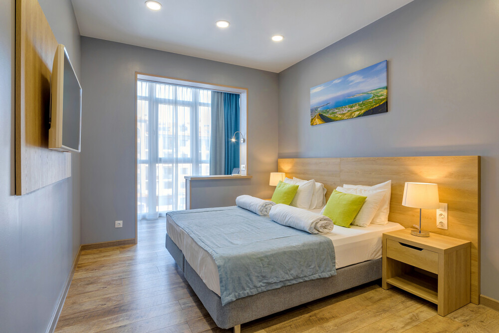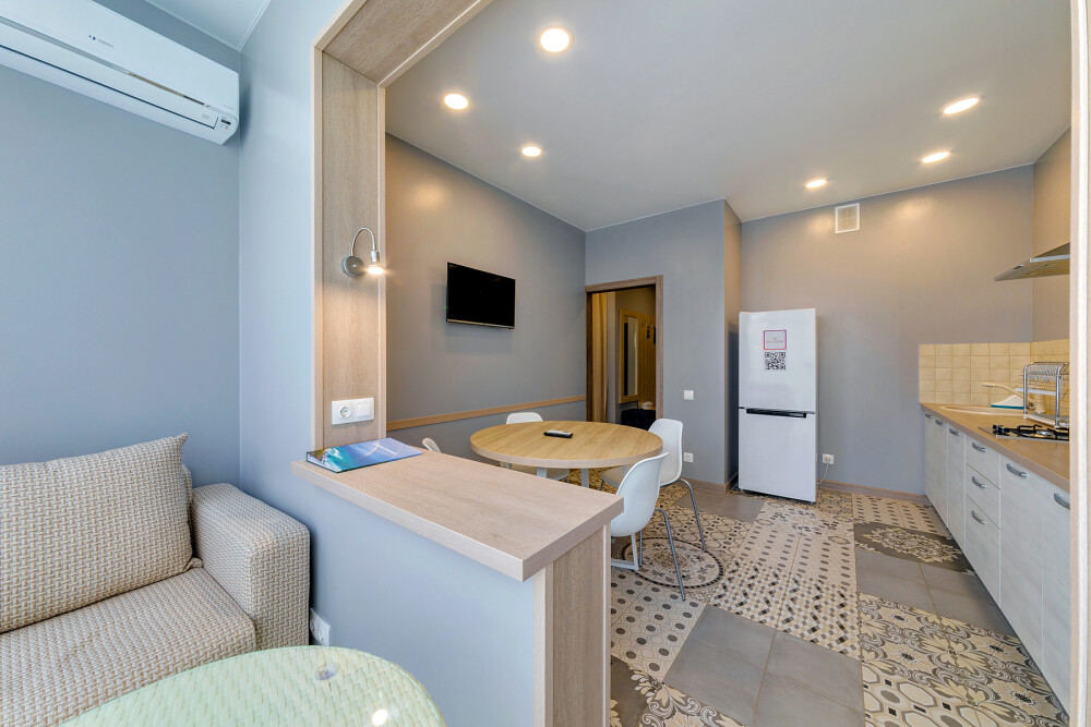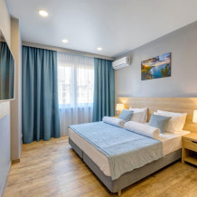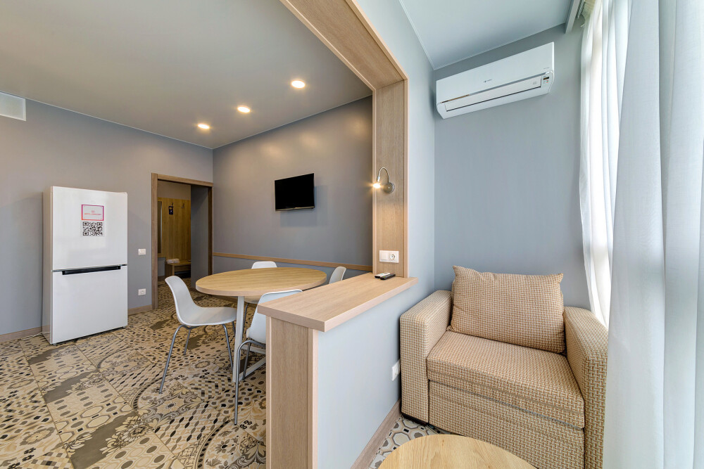 Просторный однокомнатный номер с двуспальной кроватью (при желании трансформируется в 2 односпальные) и отдельной кухней с раскладным диваном – идеальный вариант для долгой туристической поездки с друзьями или семьей. Вид из окна – на огороженную детскую площадку. Вместительный номер позволит Вам провести свой отпуск с ощущением домашнего уюта и тепла!