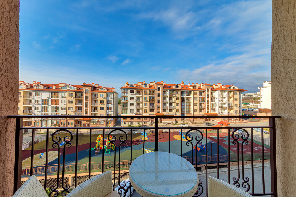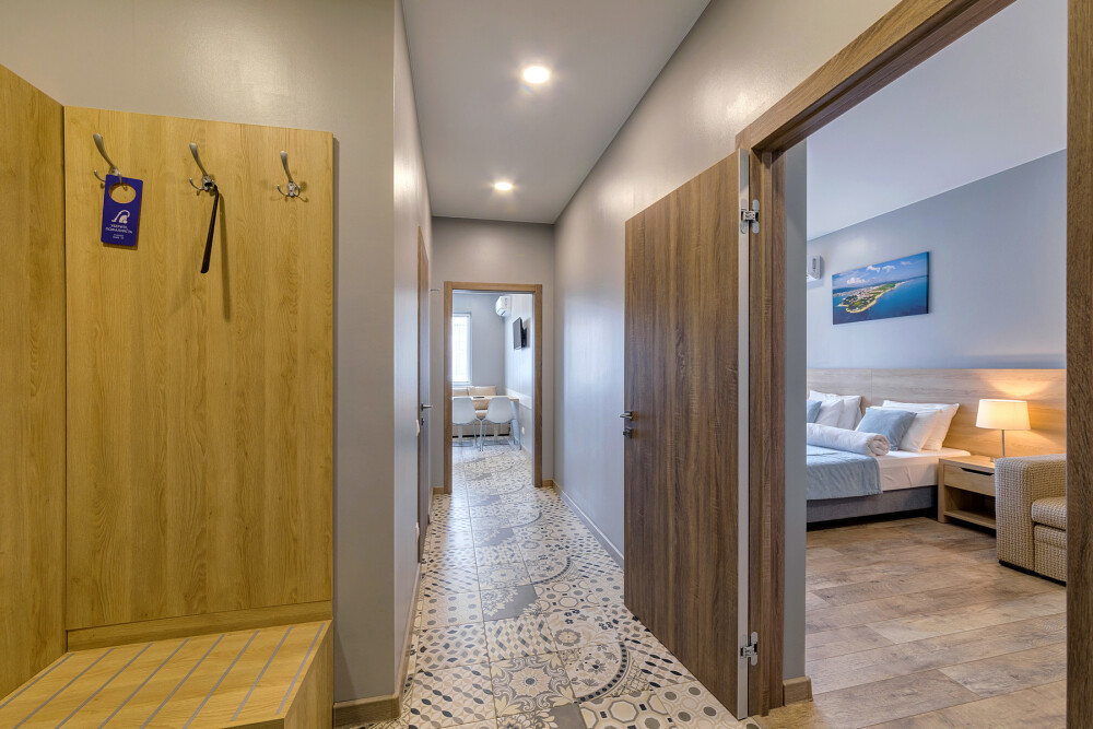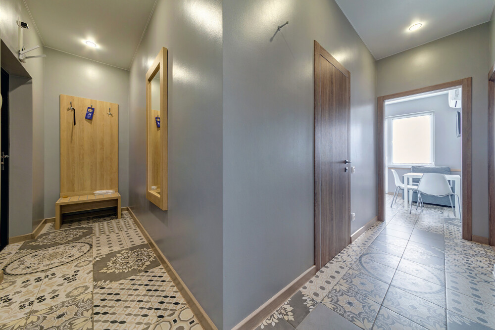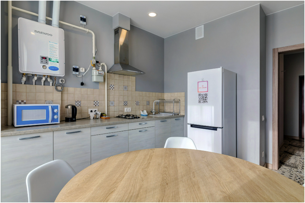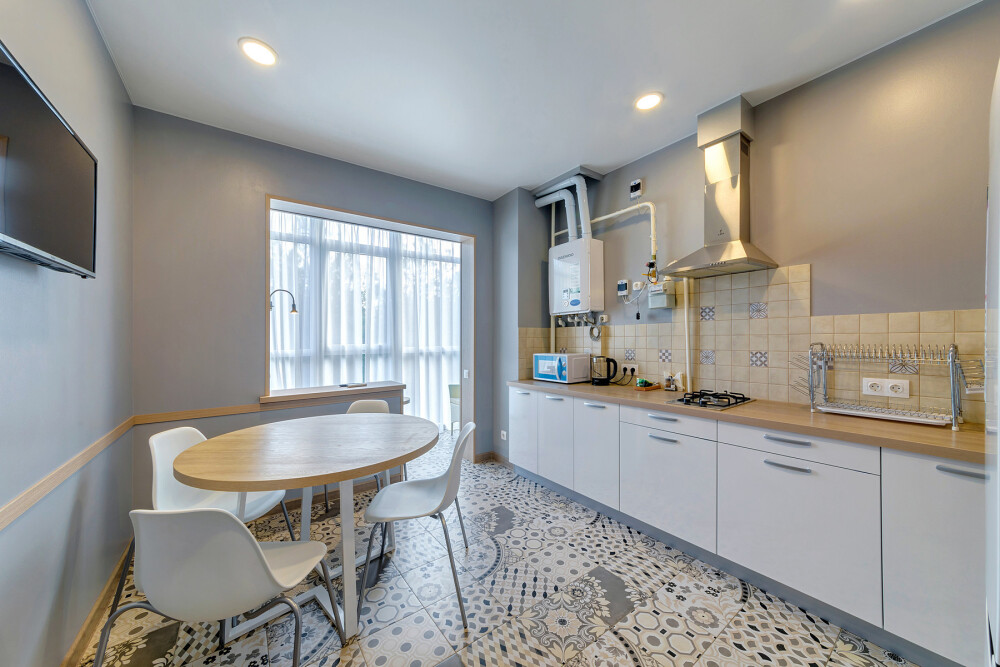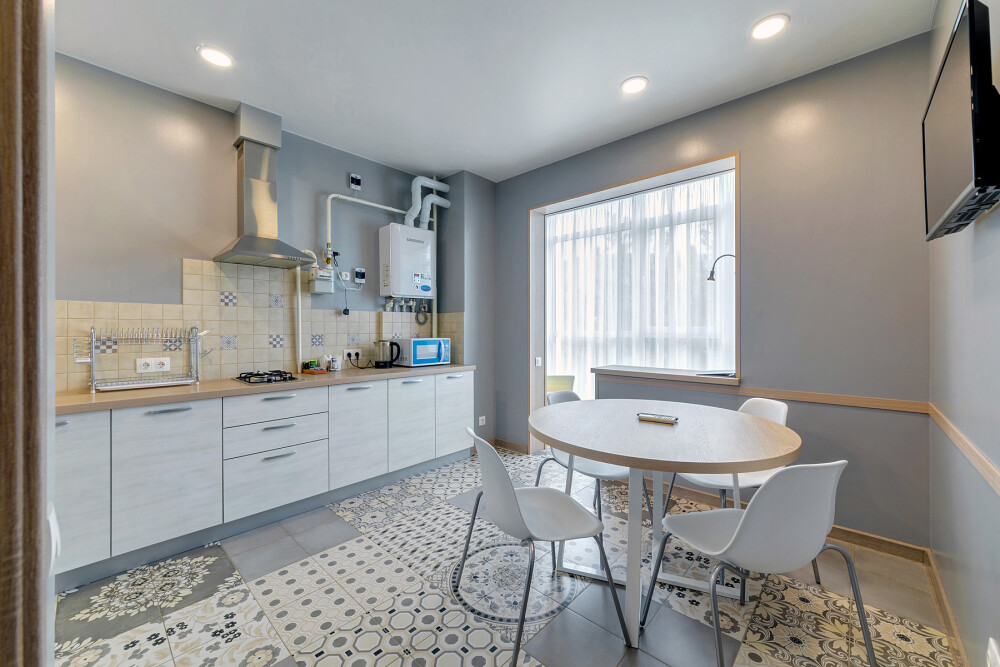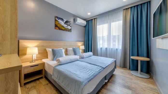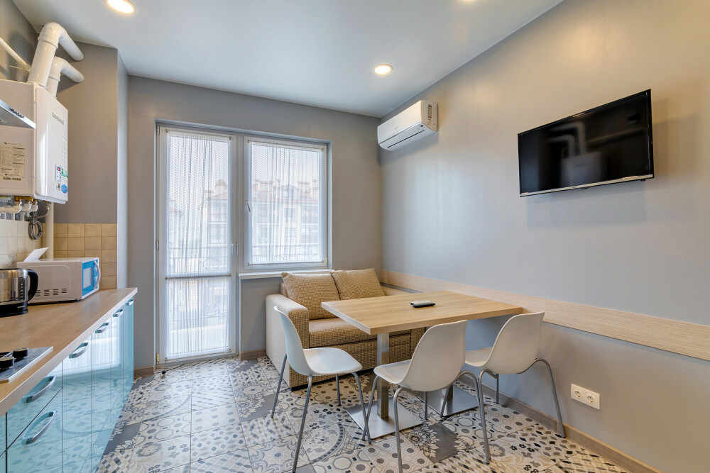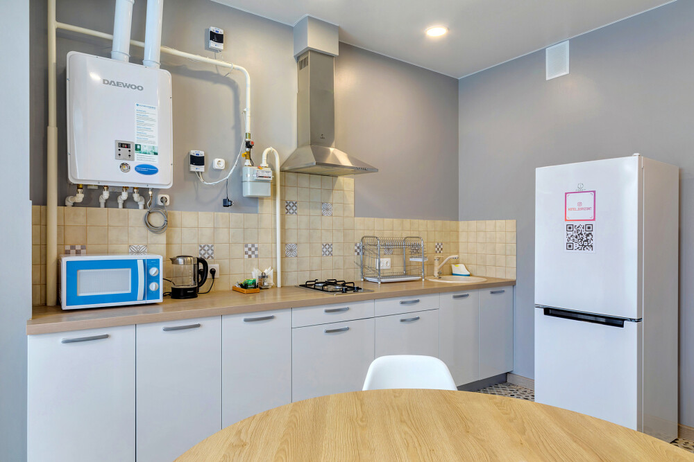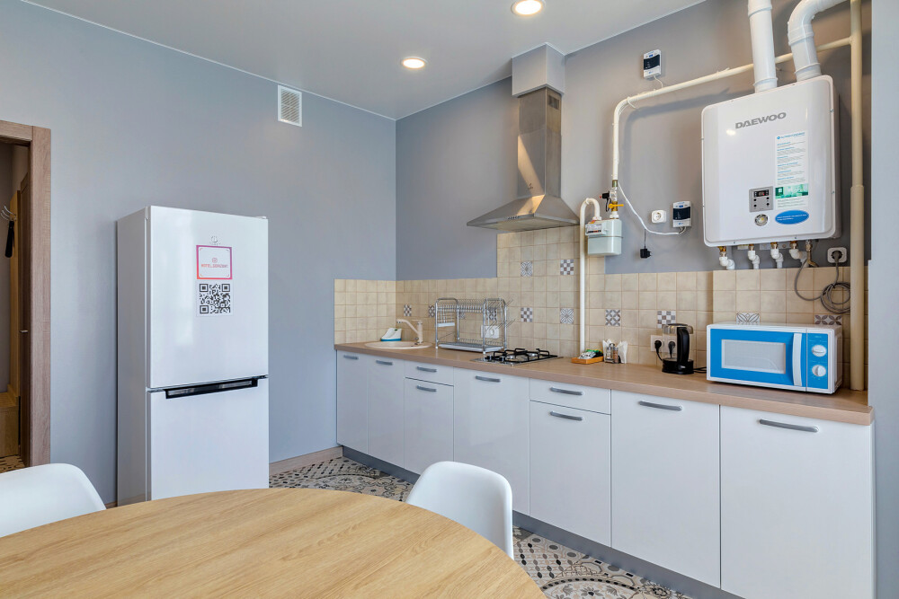 Просторный однокомнатный номер с двуспальной кроватью (при желании трансформируется в 2 односпальные) и отдельной кухней с раскладным диваном – идеальный вариант для долгой туристической поездки с друзьями или семьей. Вид из окна – на огороженную детскую площадку. Вместительный номер позволит Вам провести свой отпуск с ощущением домашнего уюта и тепла!