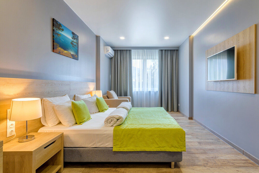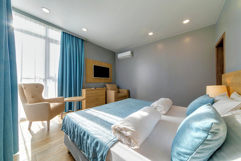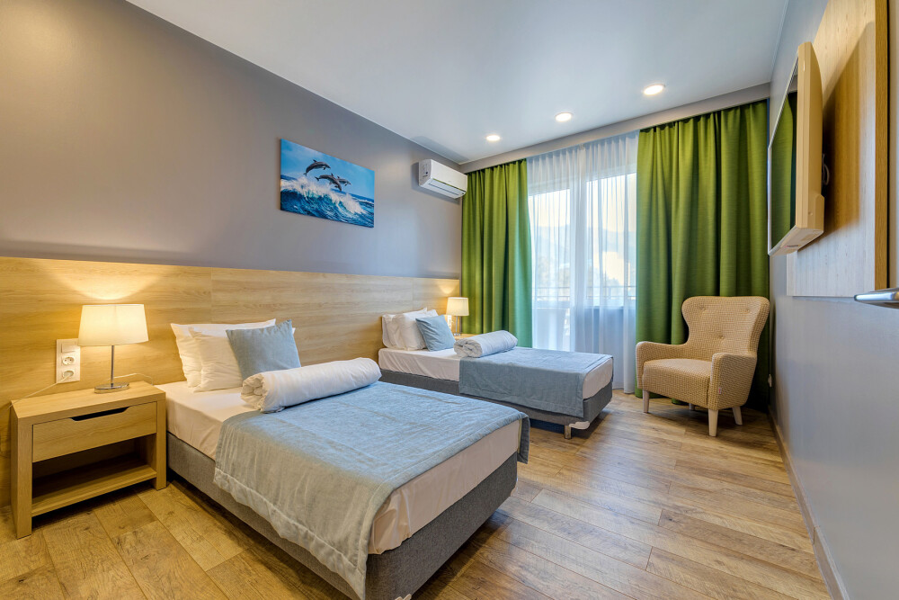 Просторные, светлые комнаты с элементами классического и современного декора с первого взгляда покорят ваши сердца своей неповторимостью и приятной атмосферой. Большинство номеров имеют вид на Маркотхский хребет и Геленджикскую бухту, а некоторые утопают в зелени рощи пицундской сосны. Есть номера с видом на огороженную детскую игровую площадку – идеальное место для игр Вашего ребёнка!