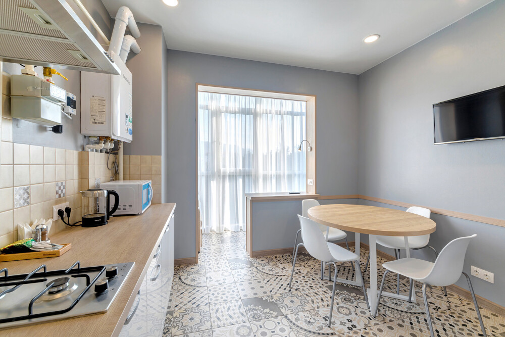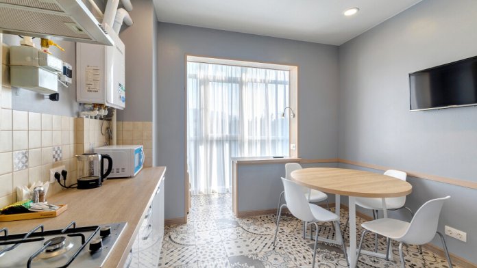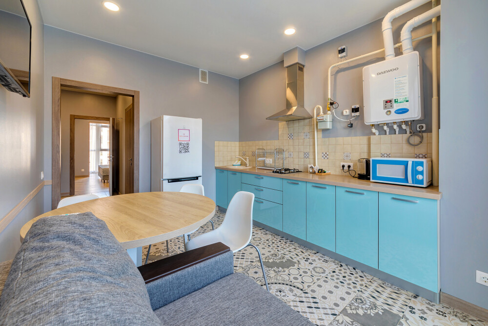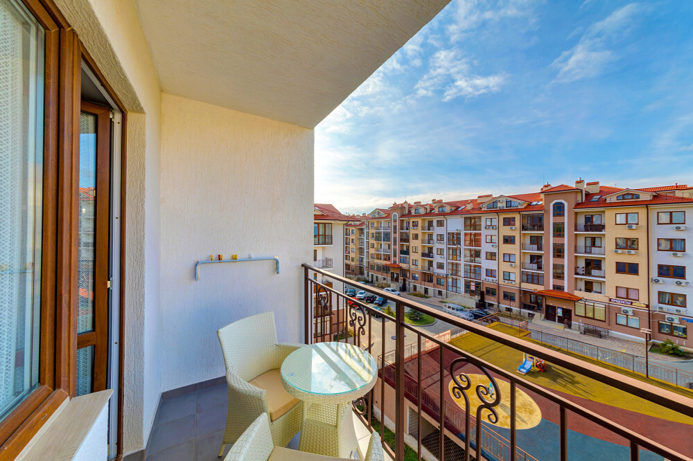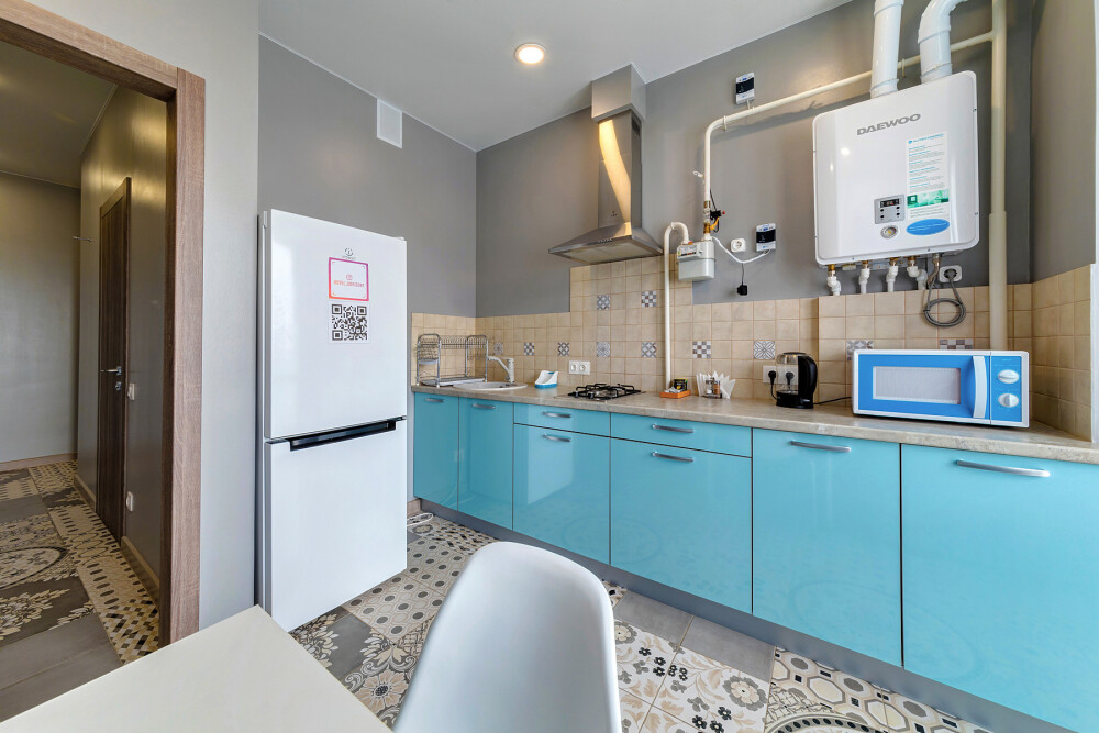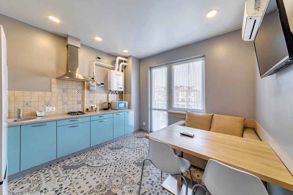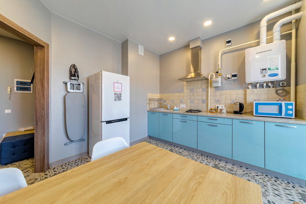 Самый вместительный однокомнатный номер с двуспальной кроватью (при желании трансформируется в 2 односпальные), раскладным креслом и отдельной кухней с раскладным диваном. С балкона, оборудованного мебелью, вид на двор с огороженной детской площадкой. Отличный вариант для большой дружной семьи!