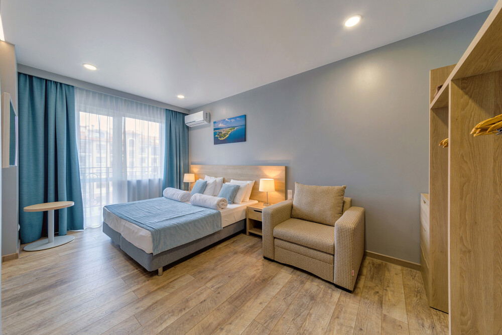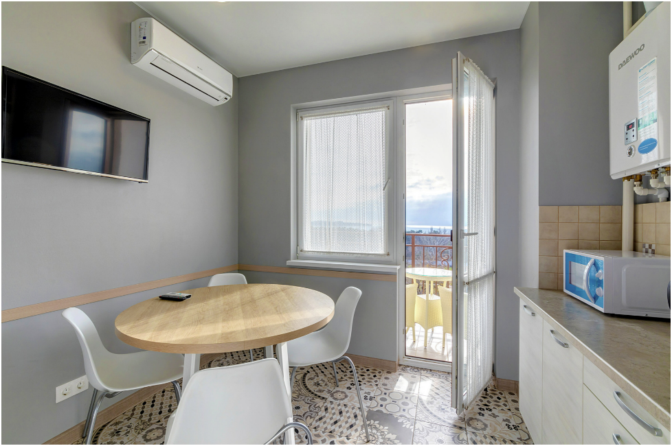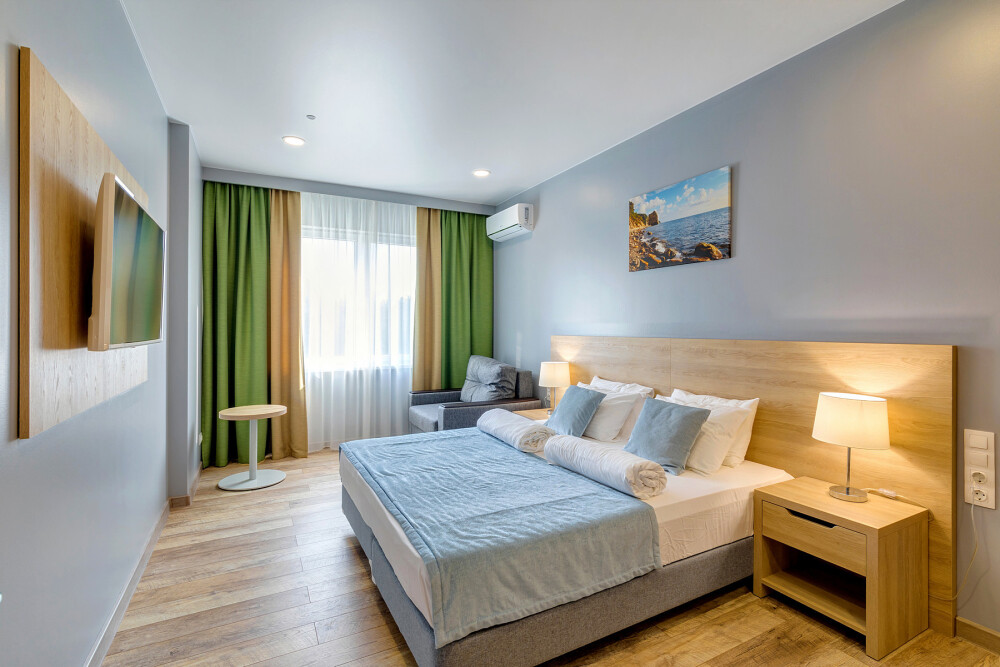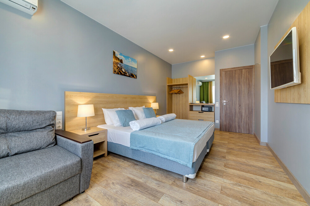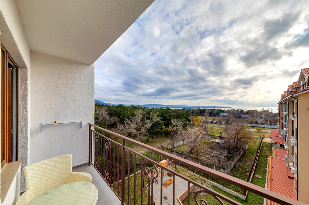 Отличный однокомнатный номер с двуспальной кроватью (при желании трансформируется в 2 односпальные), раскладным креслом и отдельной кухней. Прекрасный вид на море с балкона, оборудованного мебелью для наслаждения открывающимся видом!