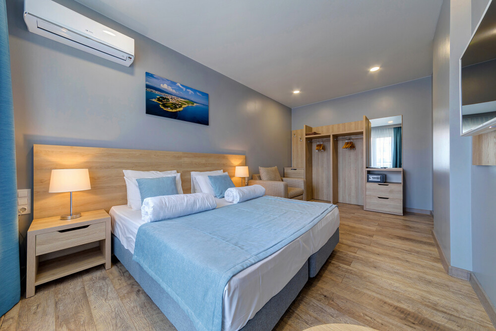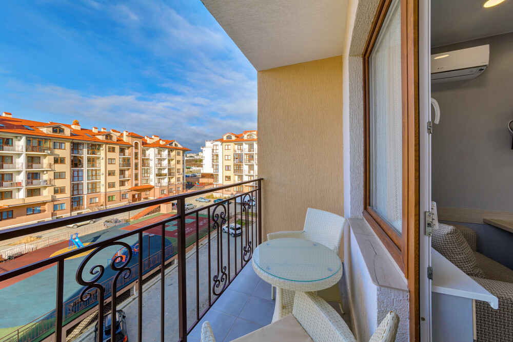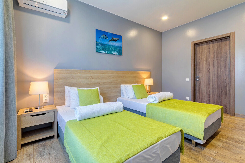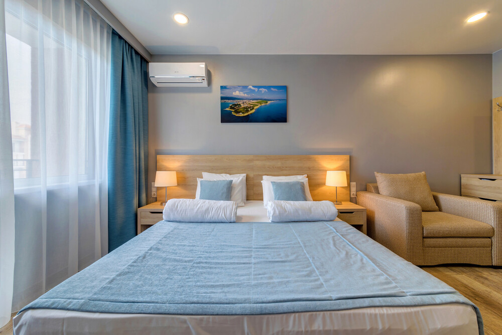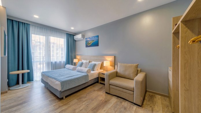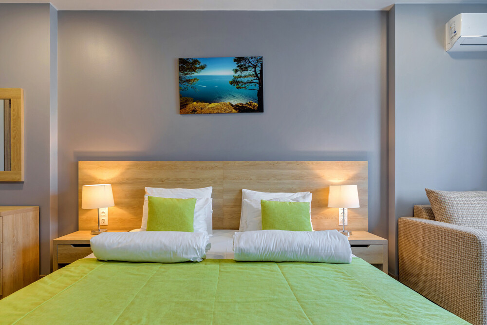 Отличный однокомнатный номер с двуспальной кроватью (при желании трансформируется в 2 односпальные), раскладным креслом и отдельной кухней. Прекрасный вид на море с балкона, оборудованного мебелью для наслаждения открывающимся видом!
