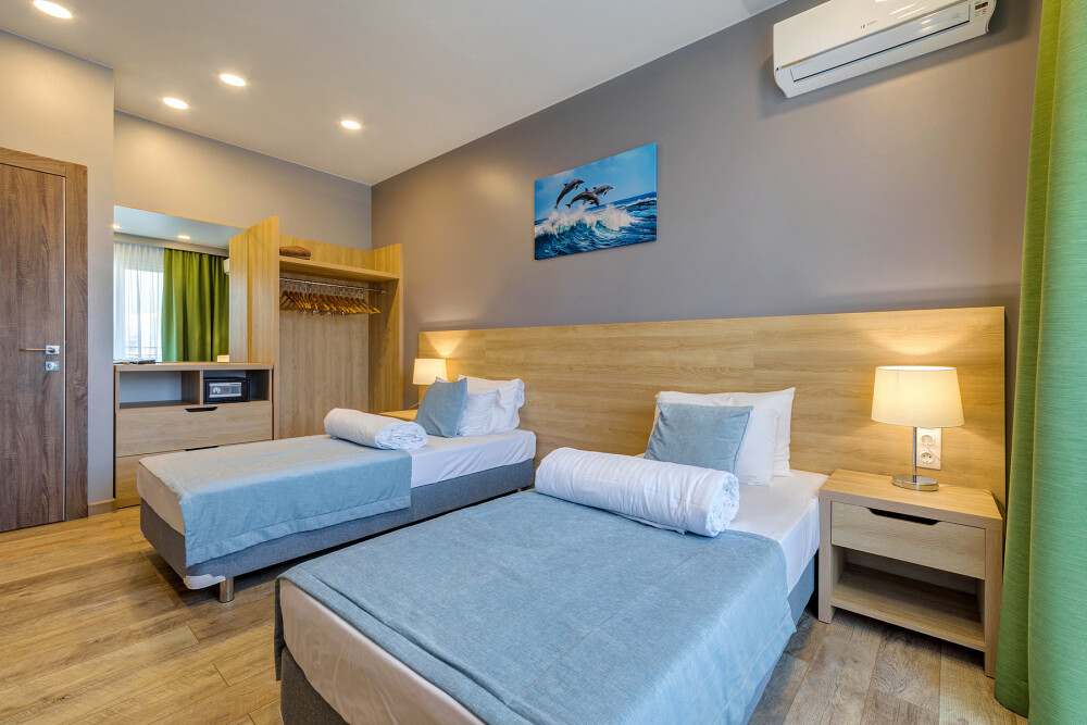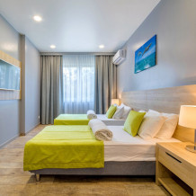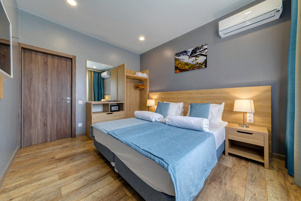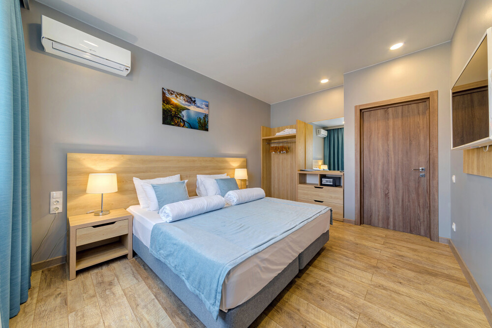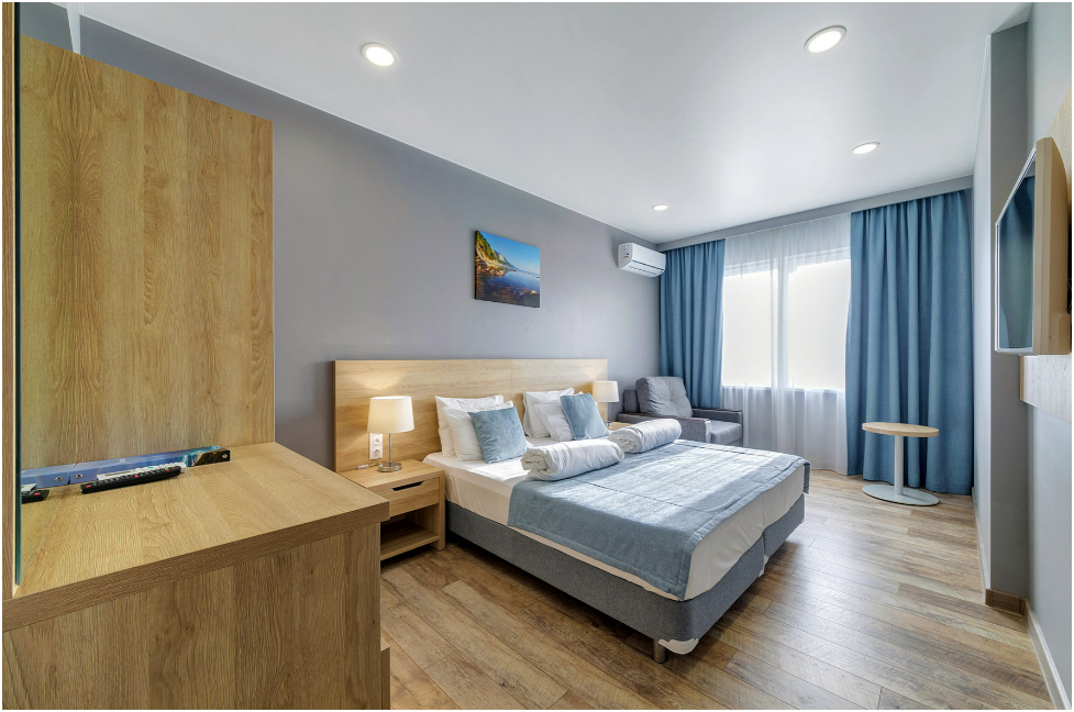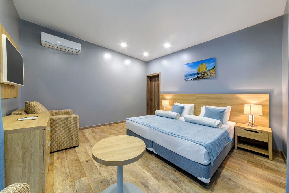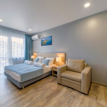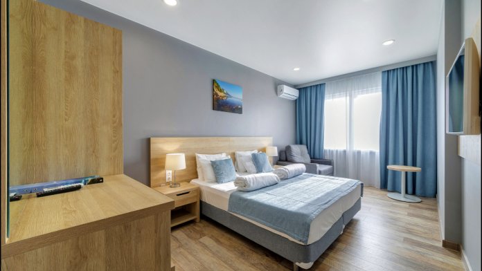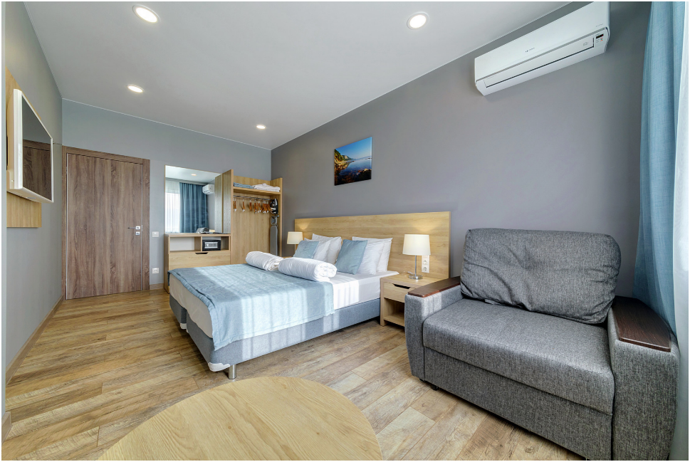 В Вашем распоряжении будет всё самое необходимое: кондиционер, русскоязычное цифровое телевидение и SMART-TV, беспроводной Интернет (Wi-Fi), сейф, ванная комната с феном и туалетными принадлежностями (гель д. душа, шампунь-кондиционер, лосьон для тела, бритвенный, зубной, косметический и швейный наборы, шапочка д. душа, губка д. тела, расчёска, ложка д. обуви), оборудованная кухня (газовая плита, микроволновая печь, электрочайник, фильтр питьевой воды, холодильник, телевизор) с необходимым набором посуды. Гостям также бесплатно предоставляются халаты, тапочки, пляжные полотенца и зонтики. Каждый номер оборудован встроенным сейфом и гладильным центром.