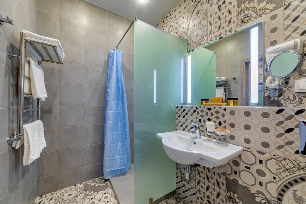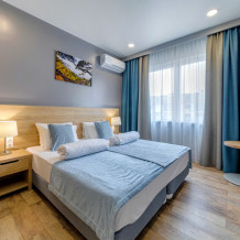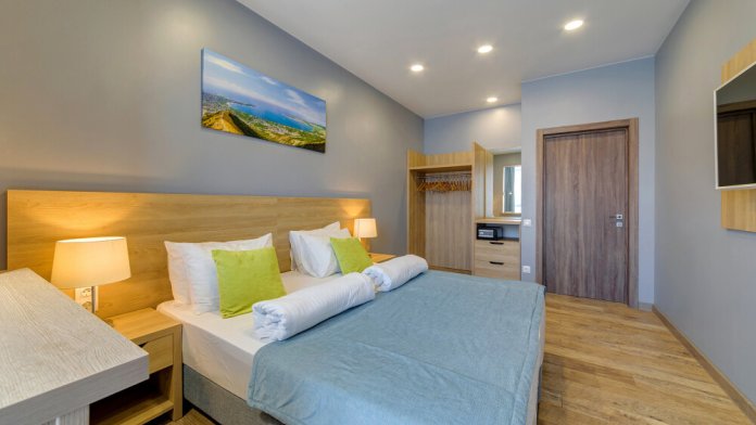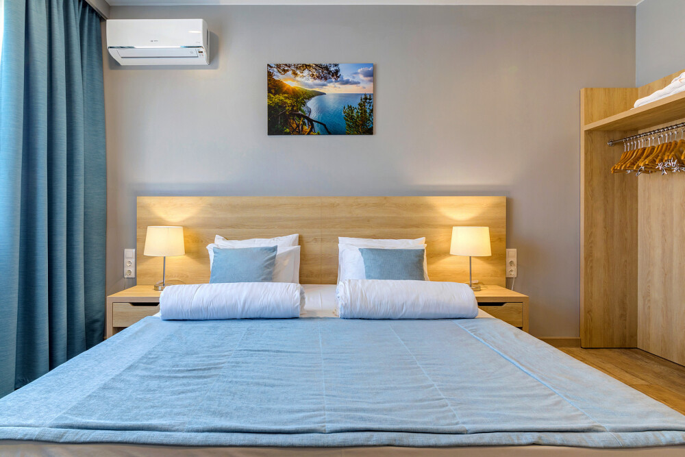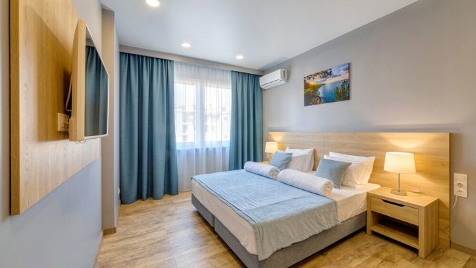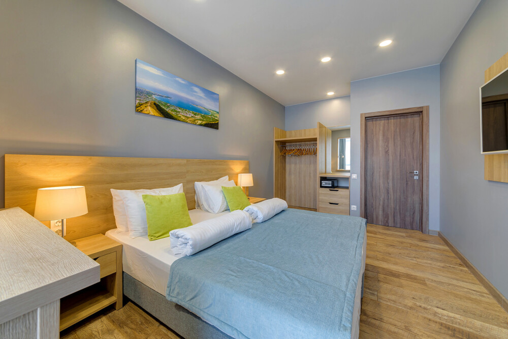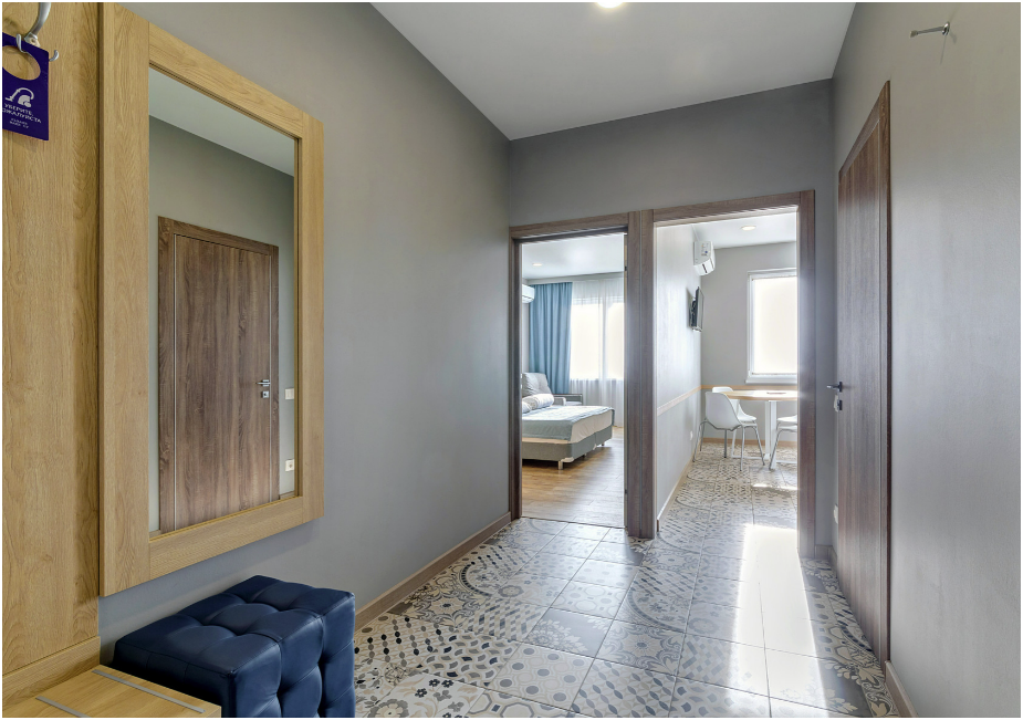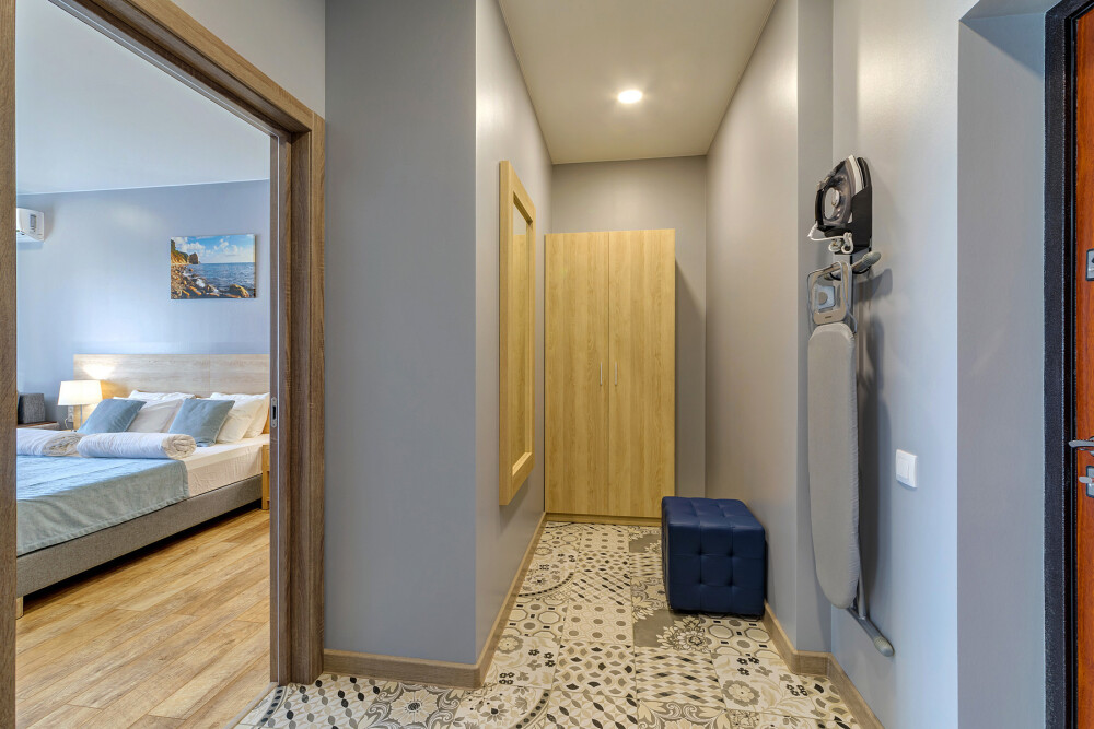 В Вашем распоряжении будет всё самое необходимое: кондиционер, русскоязычное цифровое телевидение и SMART-TV, беспроводной Интернет (Wi-Fi), сейф, ванная комната с феном и туалетными принадлежностями (гель д. душа, шампунь-кондиционер, лосьон для тела, бритвенный, зубной, косметический и швейный наборы, шапочка д. душа, губка д. тела, расчёска, ложка д. обуви), оборудованная кухня (газовая плита, микроволновая печь, электрочайник, фильтр питьевой воды, холодильник, телевизор) с необходимым набором посуды. Гостям также бесплатно предоставляются халаты, тапочки, пляжные полотенца и зонтики. Каждый номер оборудован встроенным сейфом и гладильным центром.