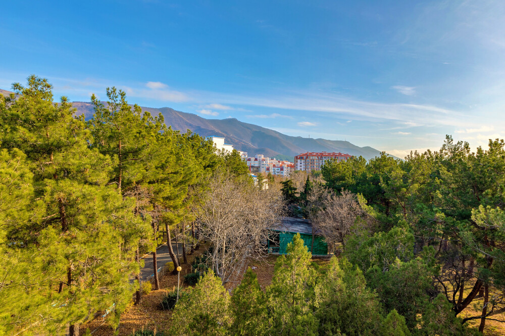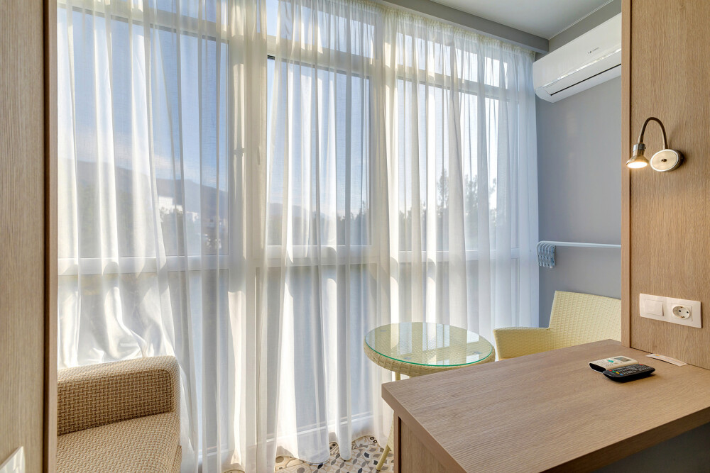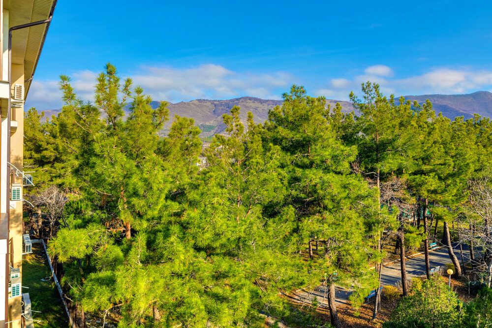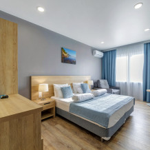 Просторный однокомнатный номер с двуспальной кроватью (при желании трансформируется в 2 односпальные), двумя раскладными креслами и отдельной кухней. Из всех окон прекрасный вид на горы и рощу пицундской сосны – отличный вариант для тихого и здорового отдыха!
