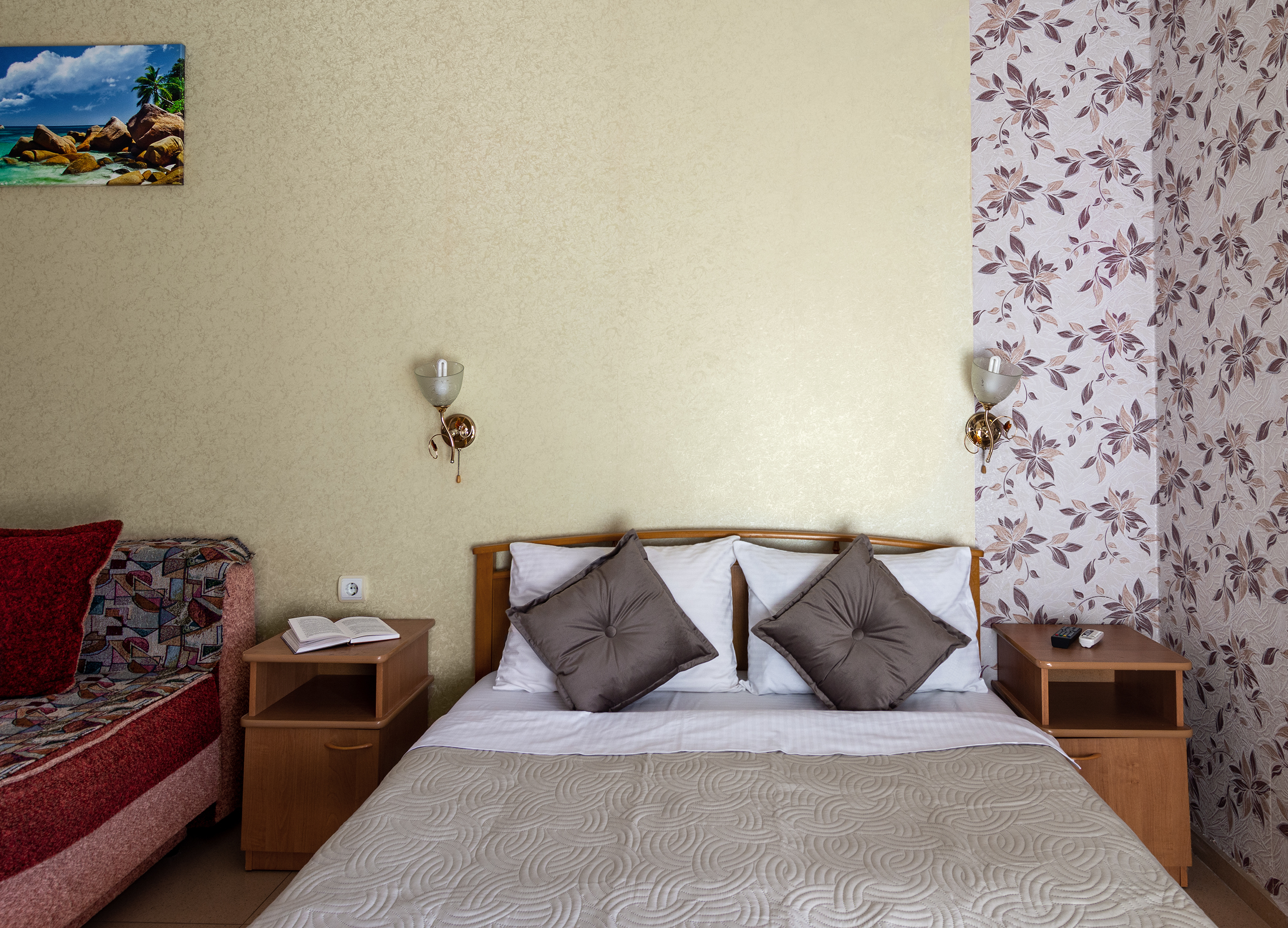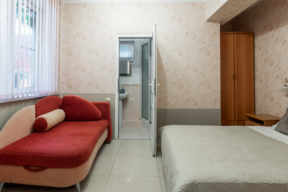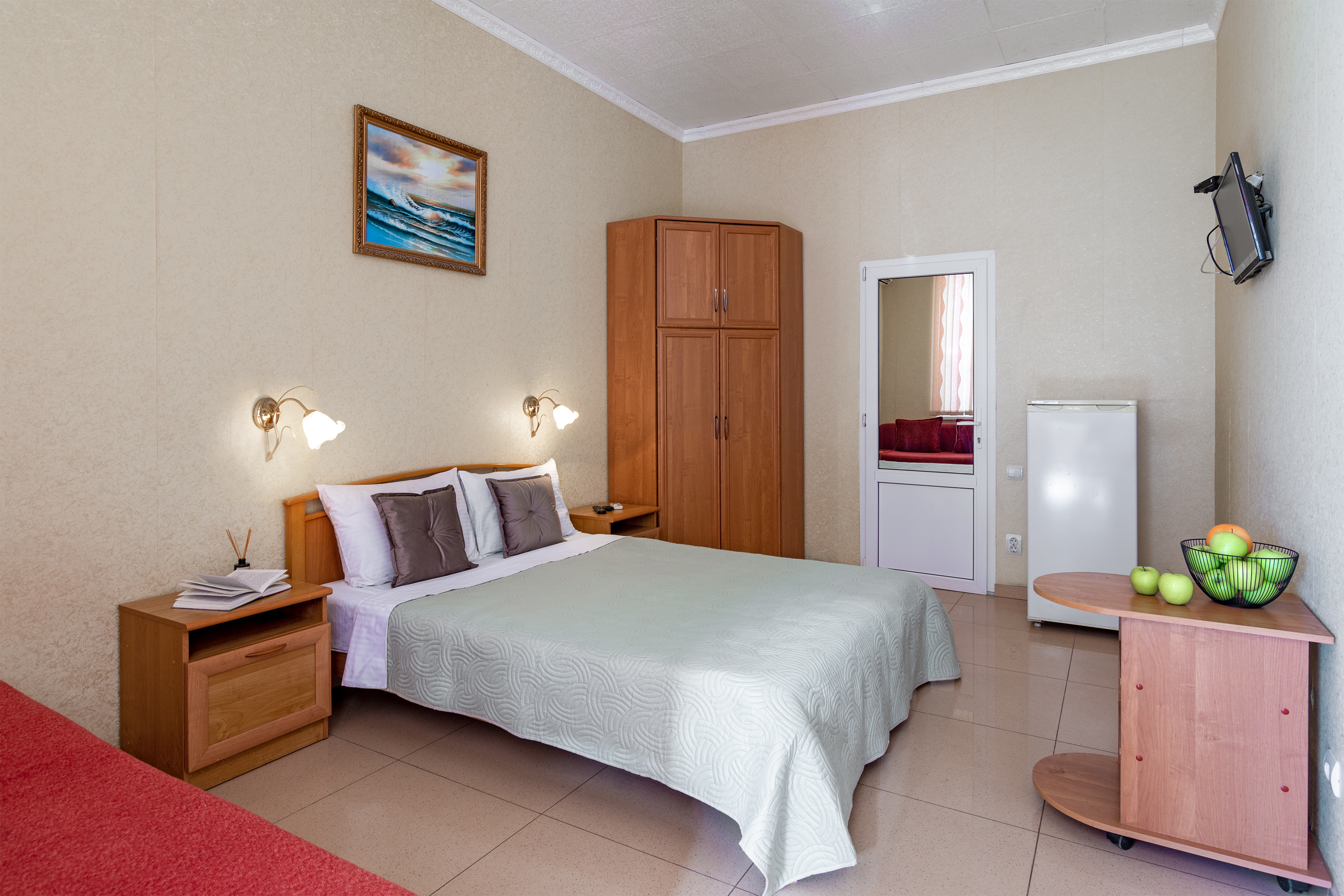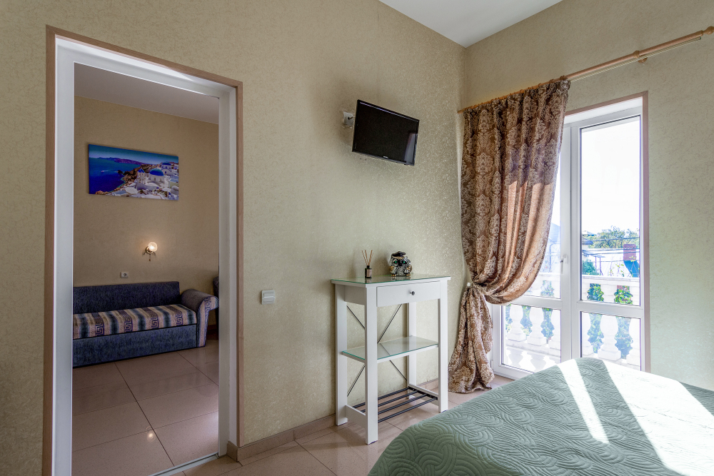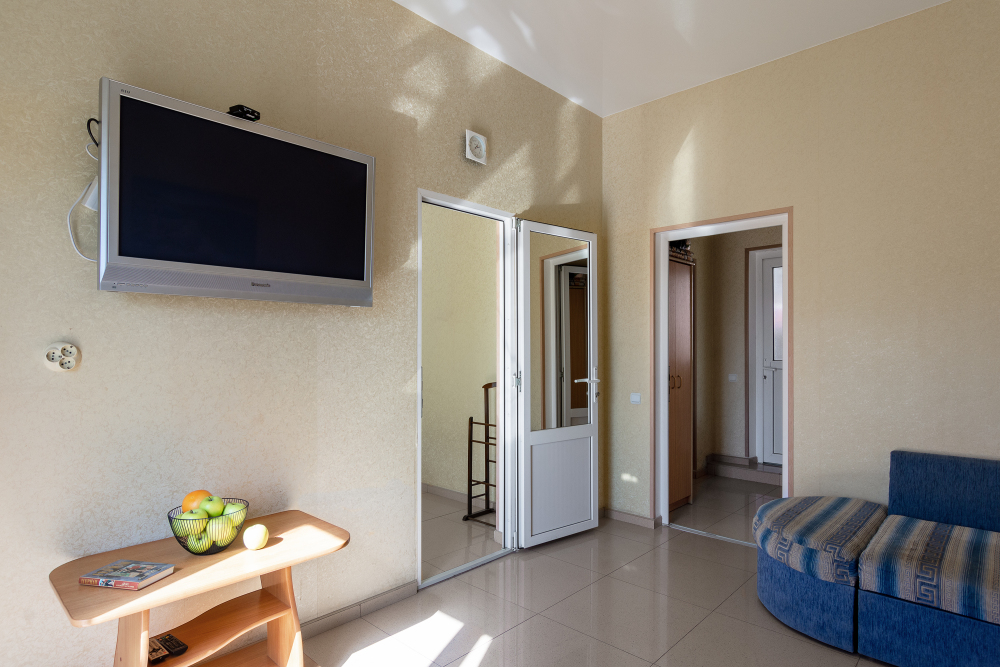 Трехместный номер категории стандарт, сплит-система, холодильник, телевизор, душ, туалет. Кровать двухспальная, диван.