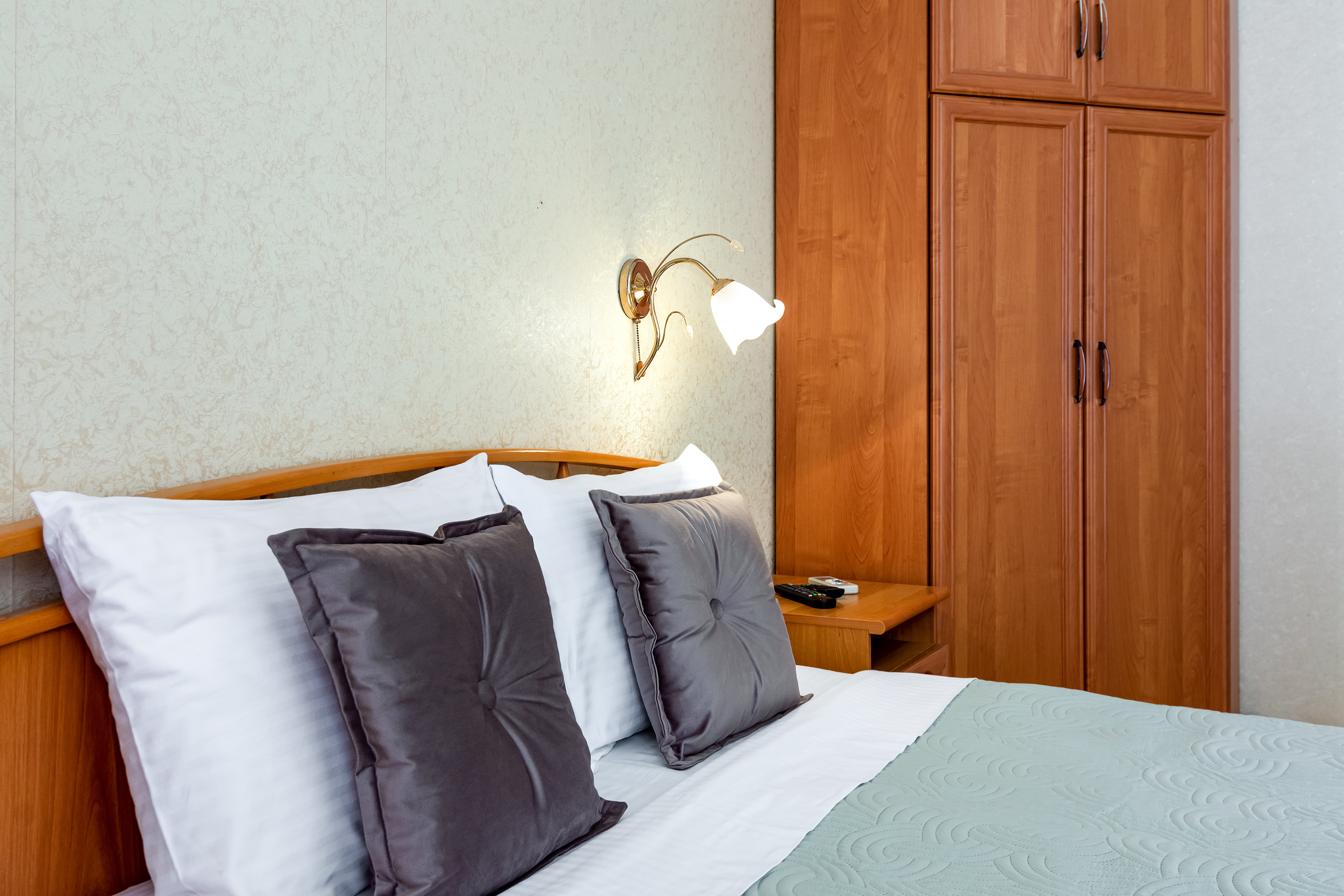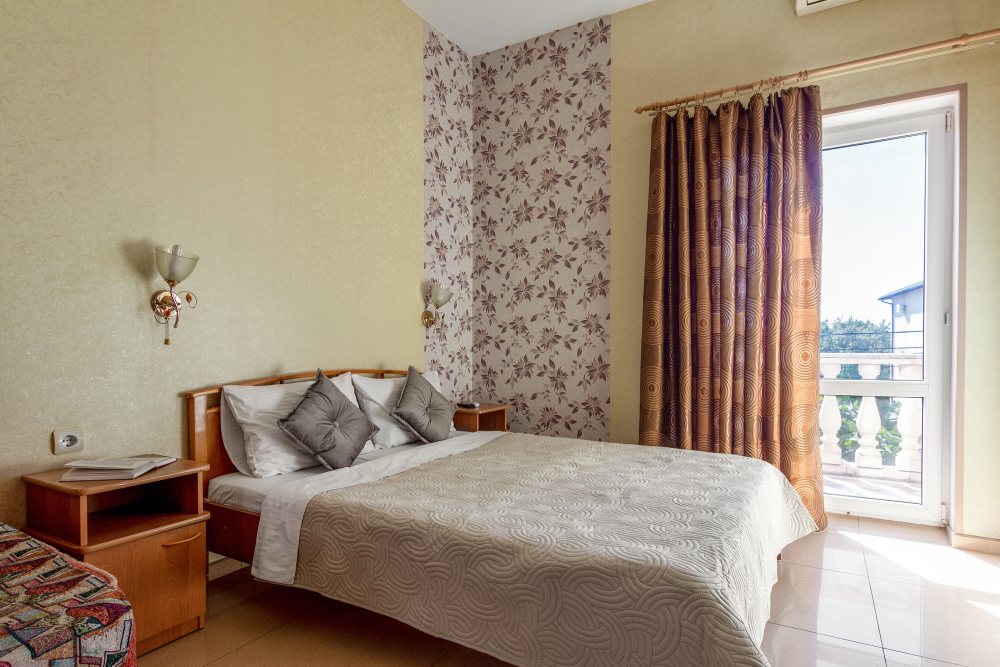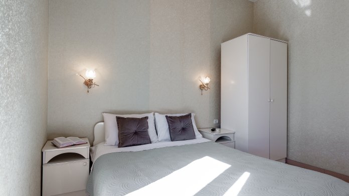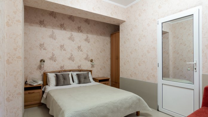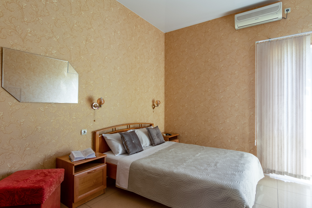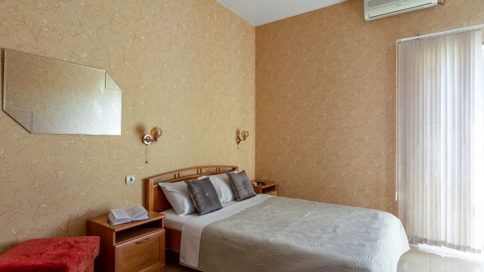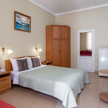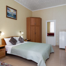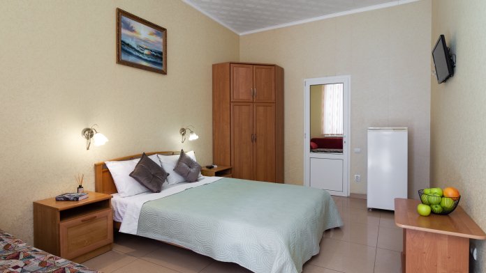 Четырёхместный номер, категории стандарт, двуспальная кровать, диван раскладывается, телевизор, холодильник, кондиционер, душ, туалет в номере.