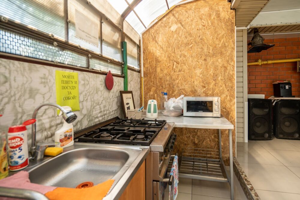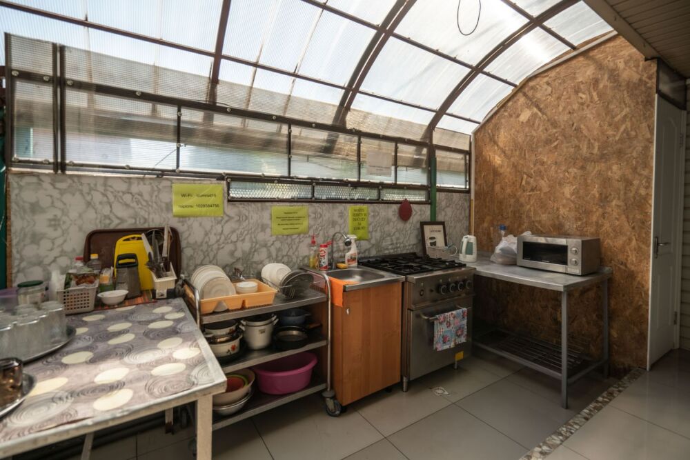На территории есть оборудованная кухня для собственного приготовления (плита, микроволновая печь, посуда).