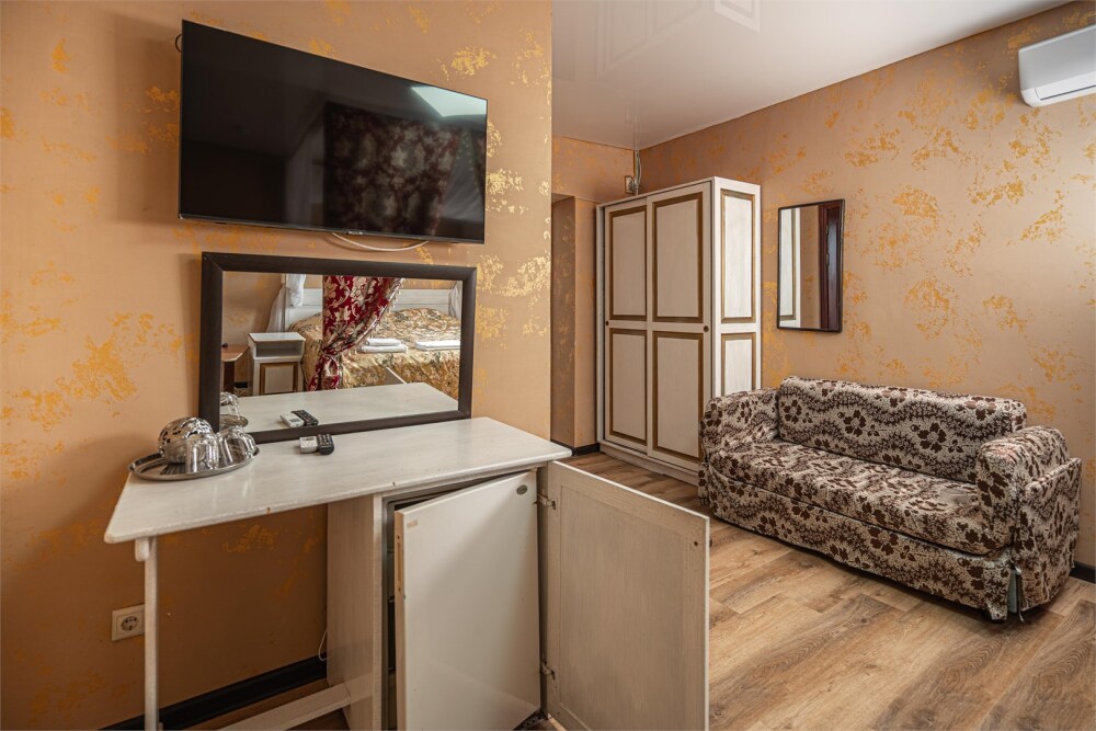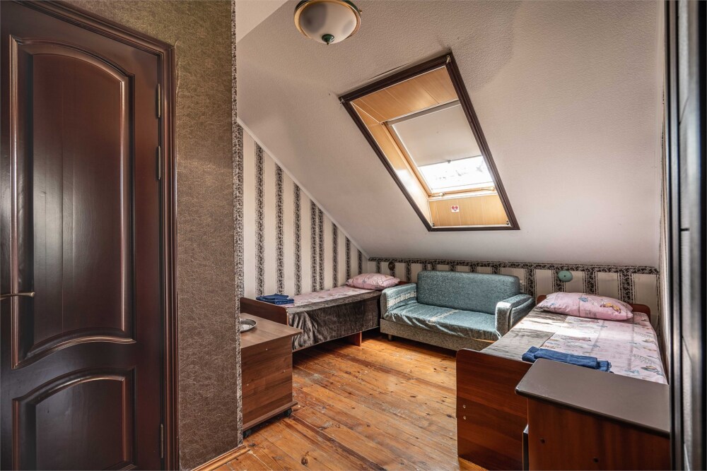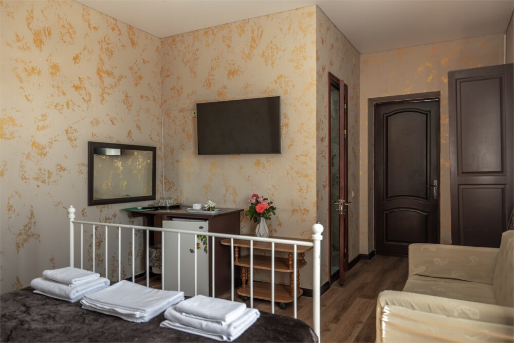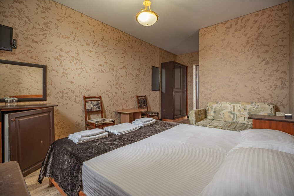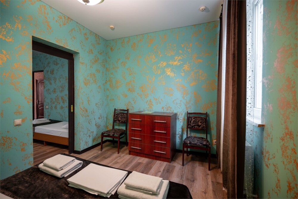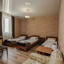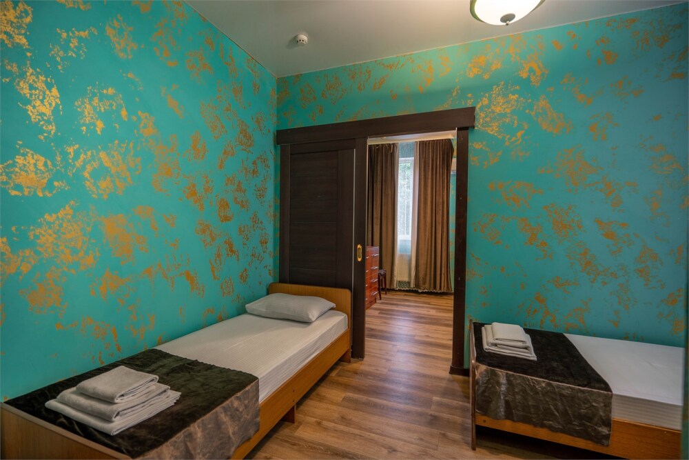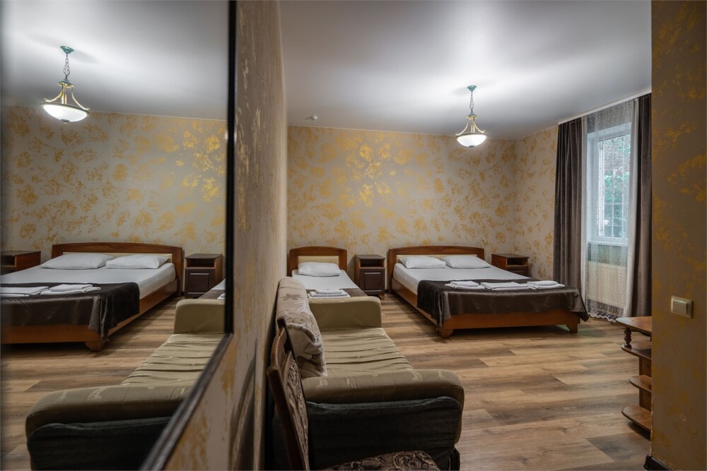 Номер с удобствами, двухкомнатный номер, двухспальная кровать и две односпальные.