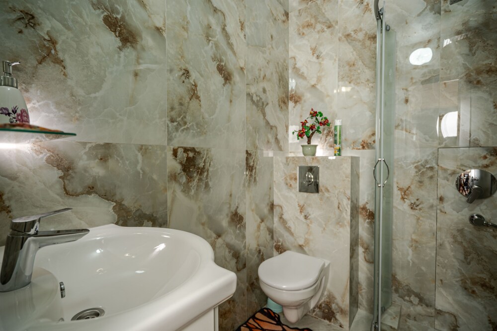 Удобства в номере, вид на море, третий этаж, рядом балкон.