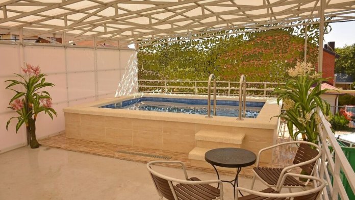 На втором этаже расположена крытая терраса с зоной отдыха и бассейном с гидромассажем размеры 3*4, отапливаемый в зимний период по запросу (входит в стоимость).