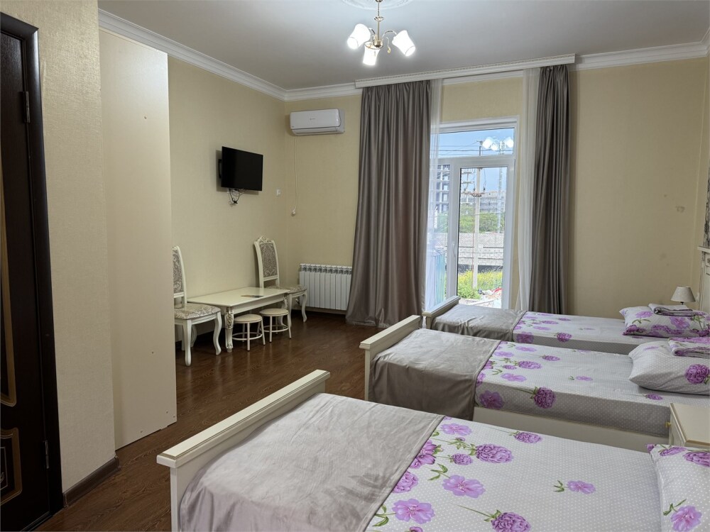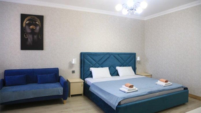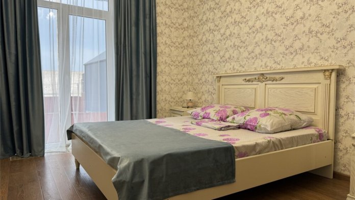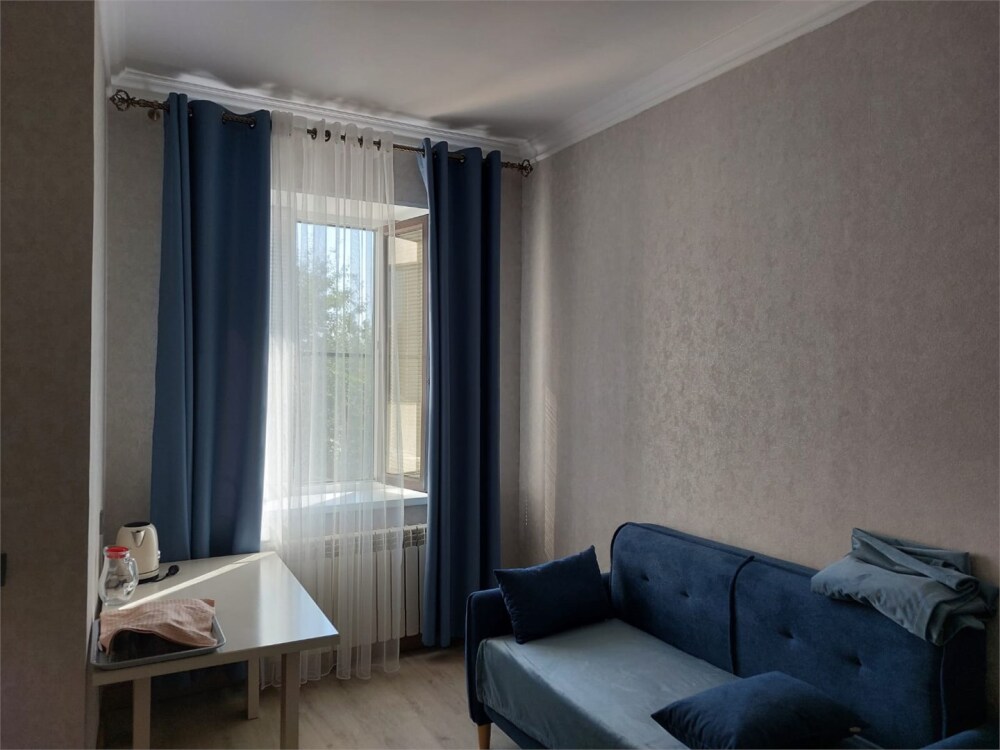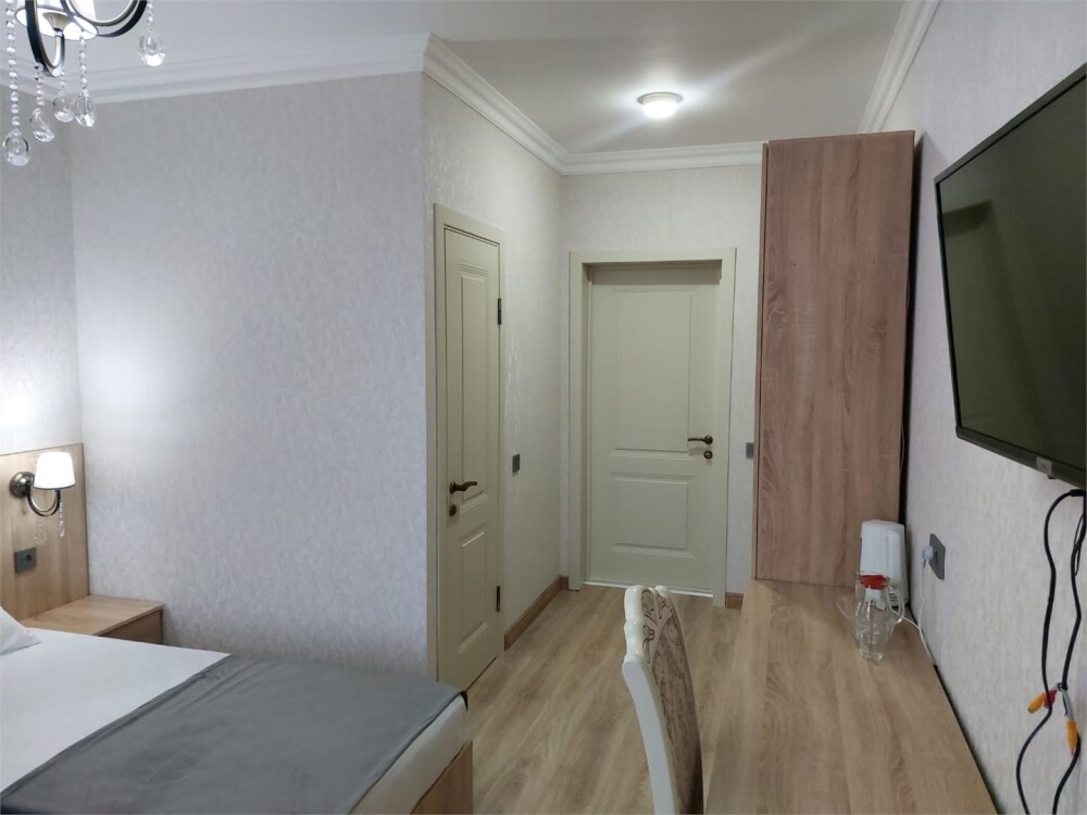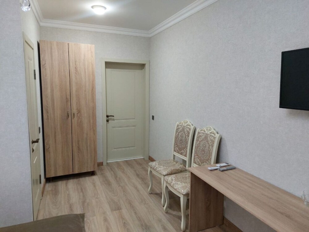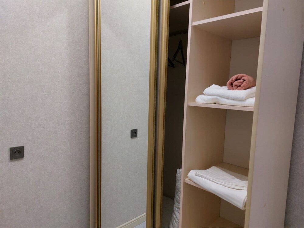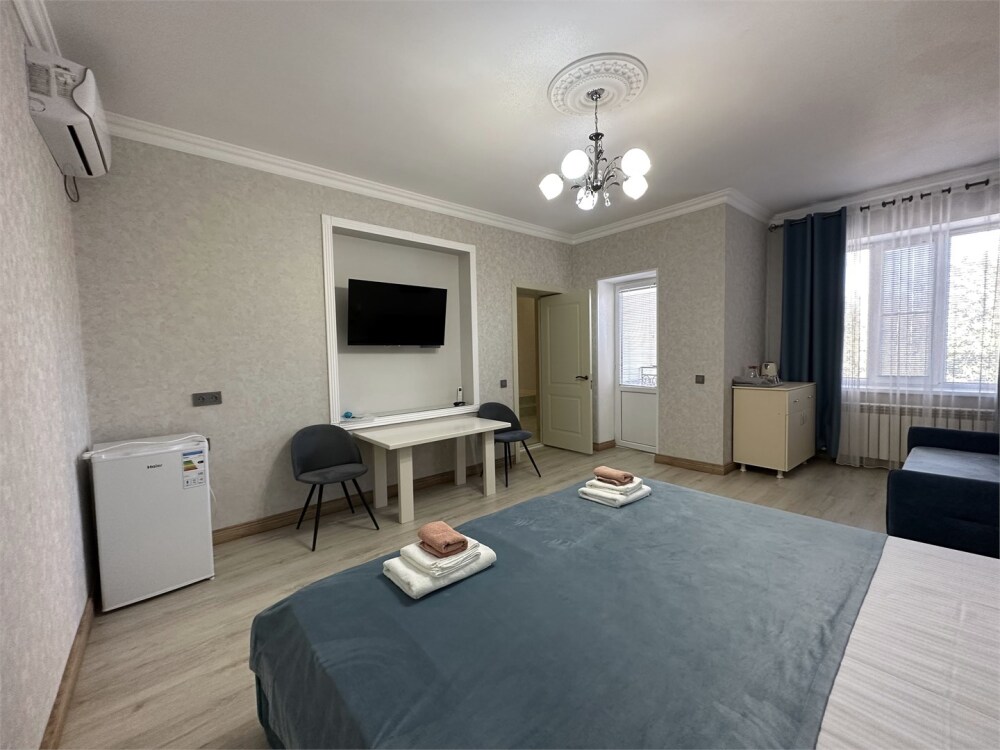 Номер с прихожей и большой комнатой. В номере есть межкомнатная дверь, разделяющая спальную зону и прихожую, своя ванная и туалет. Имеется ванна с душем, полотенцесушитель, фен, полноценный шкаф для одежды и обуви. Основное спальное место - кровать 2*2, дополнительно есть диван-кровать со спальным местом 1*4*1.9. В комнате большой smart-телевизор, беспроводной интернет, электрический чайник, чайный столик и минимальный набор посуды.
