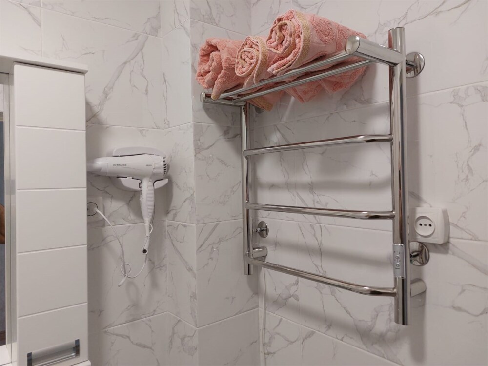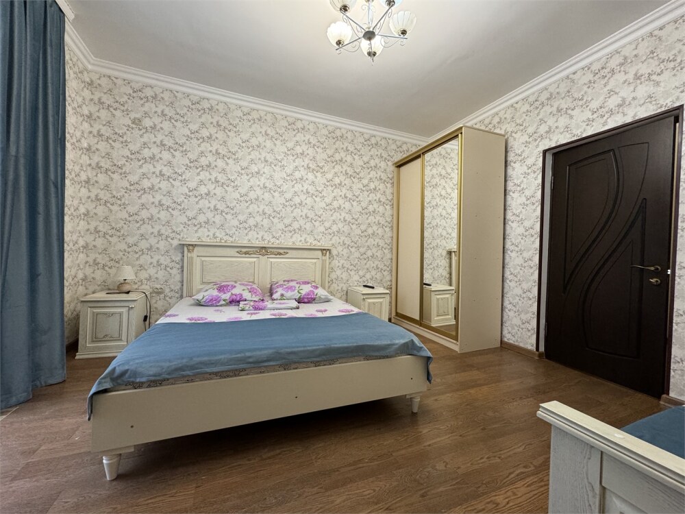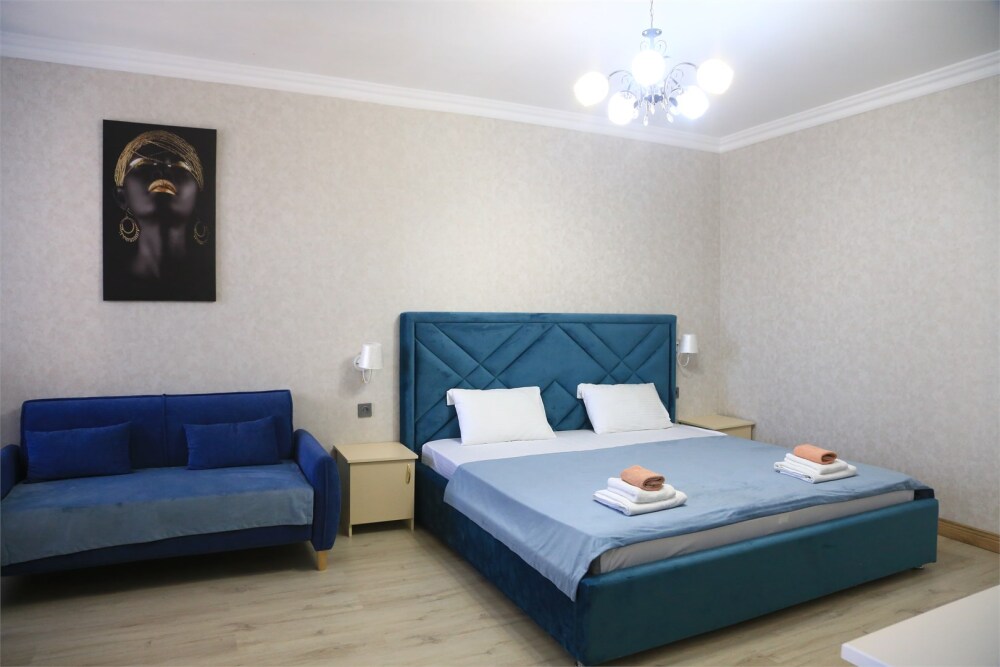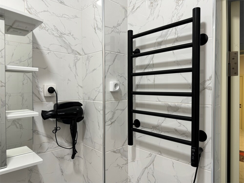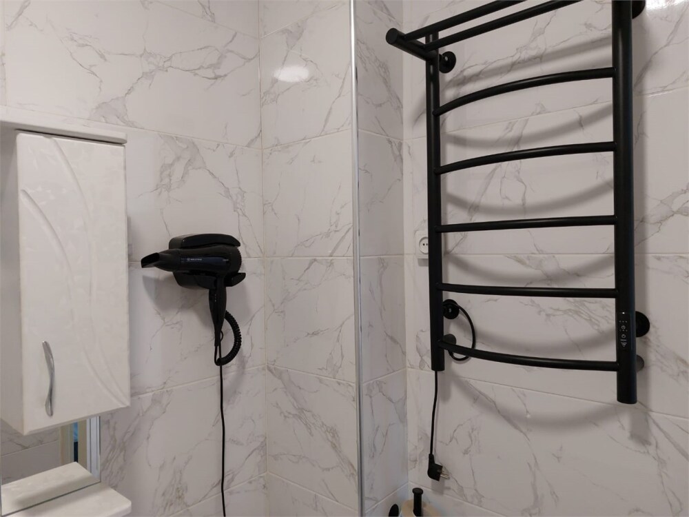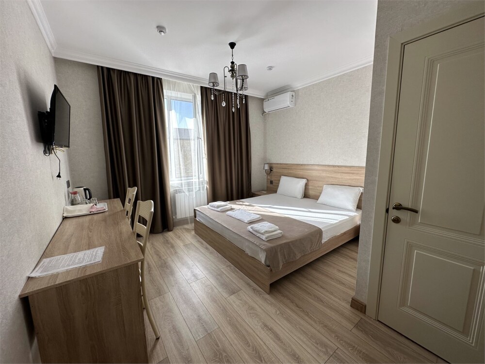 Номер с прихожей и большой комнатой. В номере есть межкомнатная дверь, разделяющая спальную зону и прихожую, своя ванная и туалет. Имеется ванна с душем, полотенцесушитель, фен, полноценный шкаф для одежды и обуви. Основное спальное место - кровать 2*2, дополнительно есть диван-кровать со спальным местом 1*4*1.9. В комнате большой smart-телевизор, беспроводной интернет, электрический чайник, чайный столик и минимальный набор посуды.