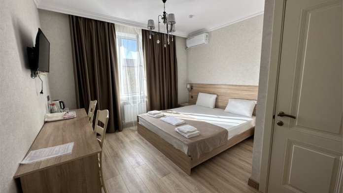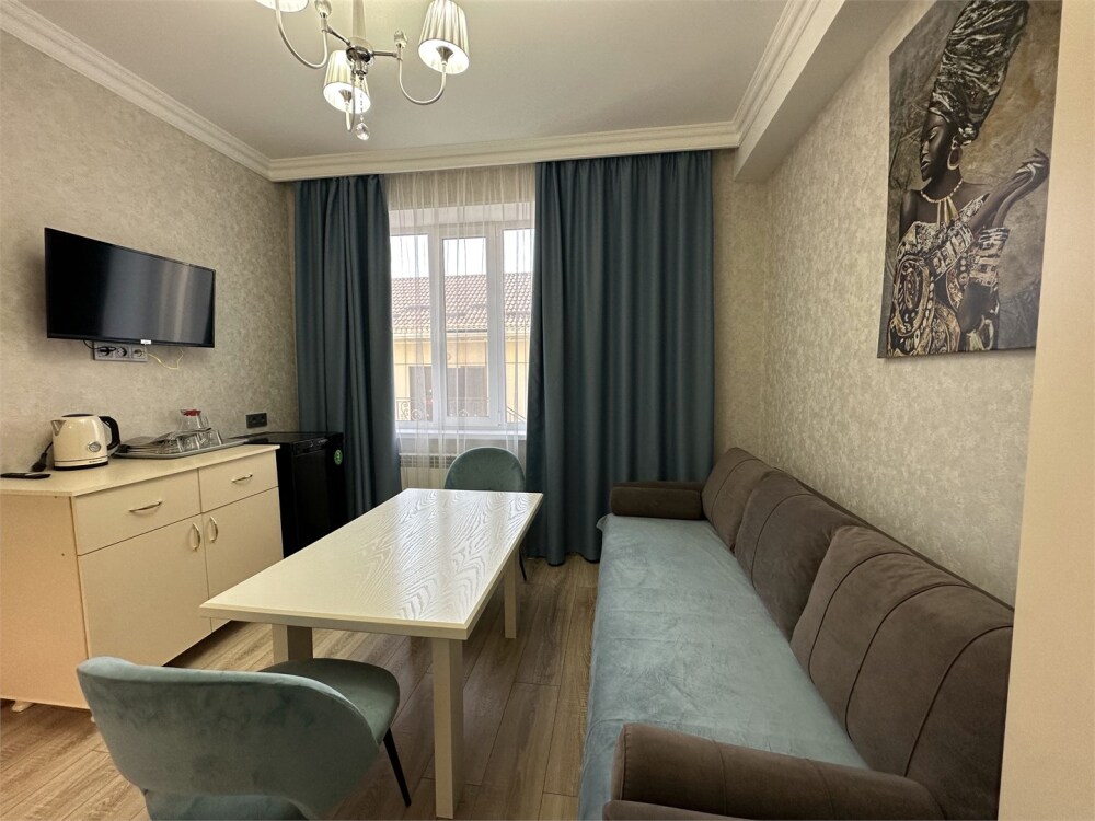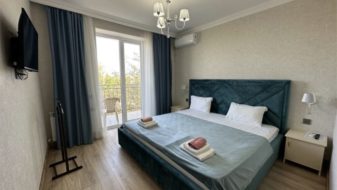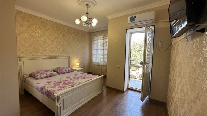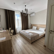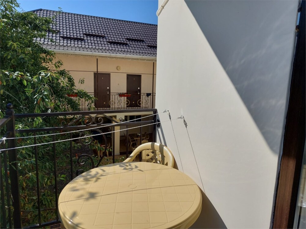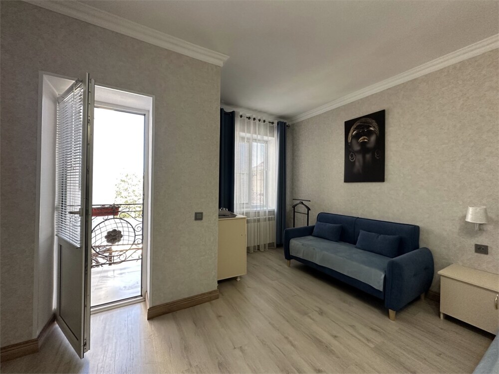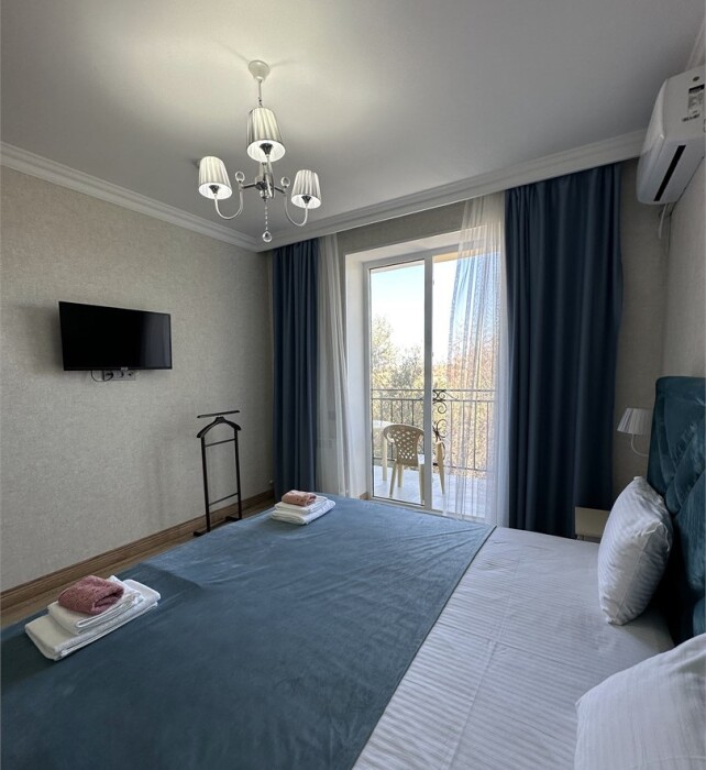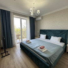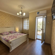 Двухкомнатный номер категории Люкс с балконом, откуда открывается частичный вид на море. Кровать в номере 2*2 и диван-кровать со спальным местом 1.8*1.9м. В номере 2 телевизора, беспроводной интернет, холодильник, обеденный стол, шкаф для одежды, электрический чайник и минимальный набор посуды. За климат отвечает сплит-система и система отопления.