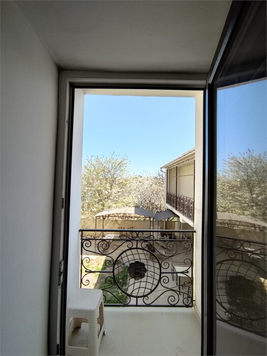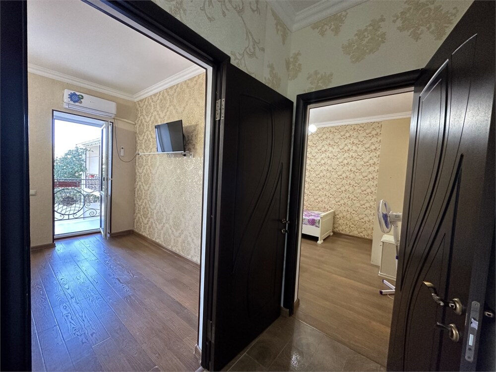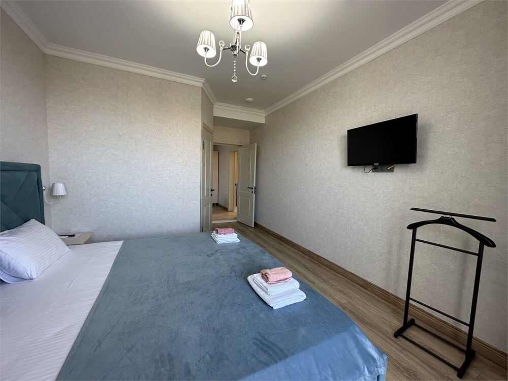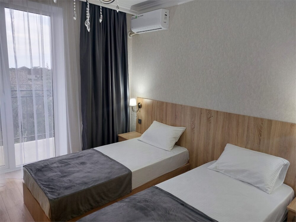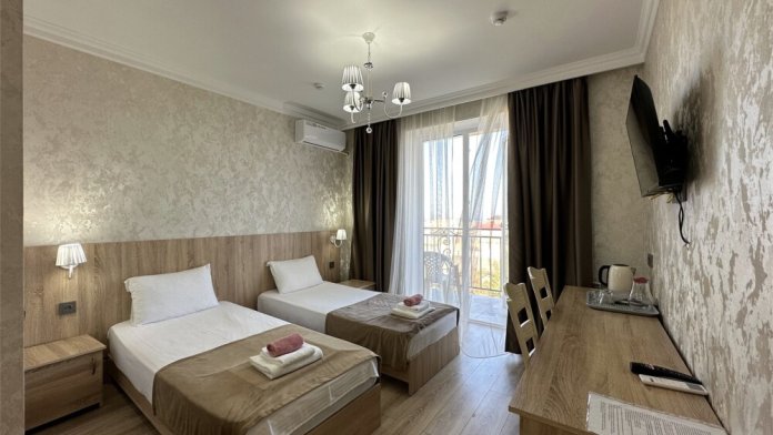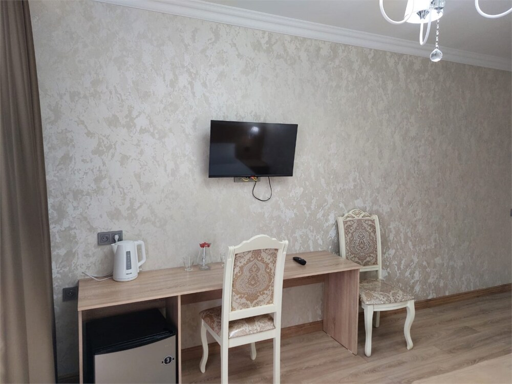 Двухкомнатный номер категории Люкс с балконом, откуда открывается частичный вид на море. Кровать в номере 2*2 и диван-кровать со спальным местом 1.8*1.9м. В номере 2 телевизора, беспроводной интернет, холодильник, обеденный стол, шкаф для одежды, электрический чайник и минимальный набор посуды. За климат отвечает сплит-система и система отопления.