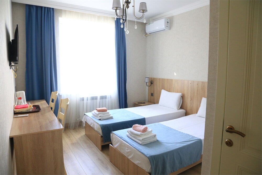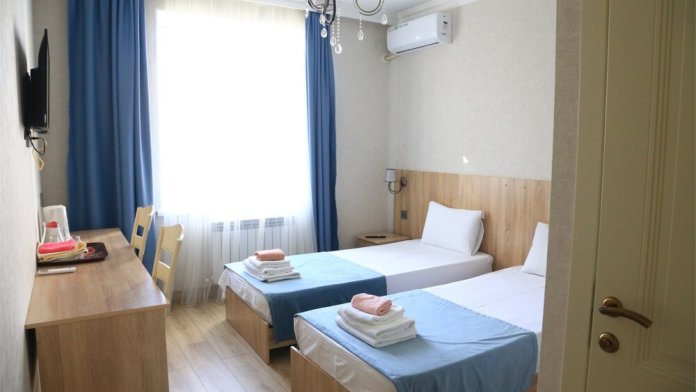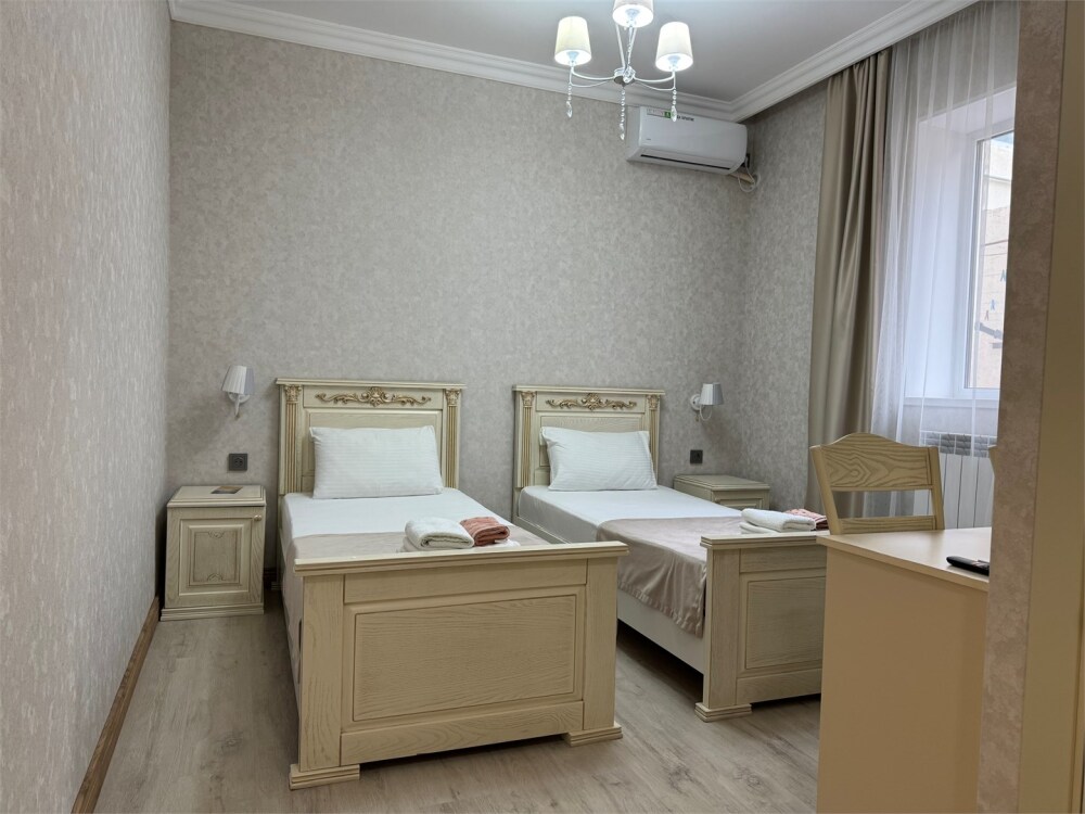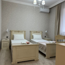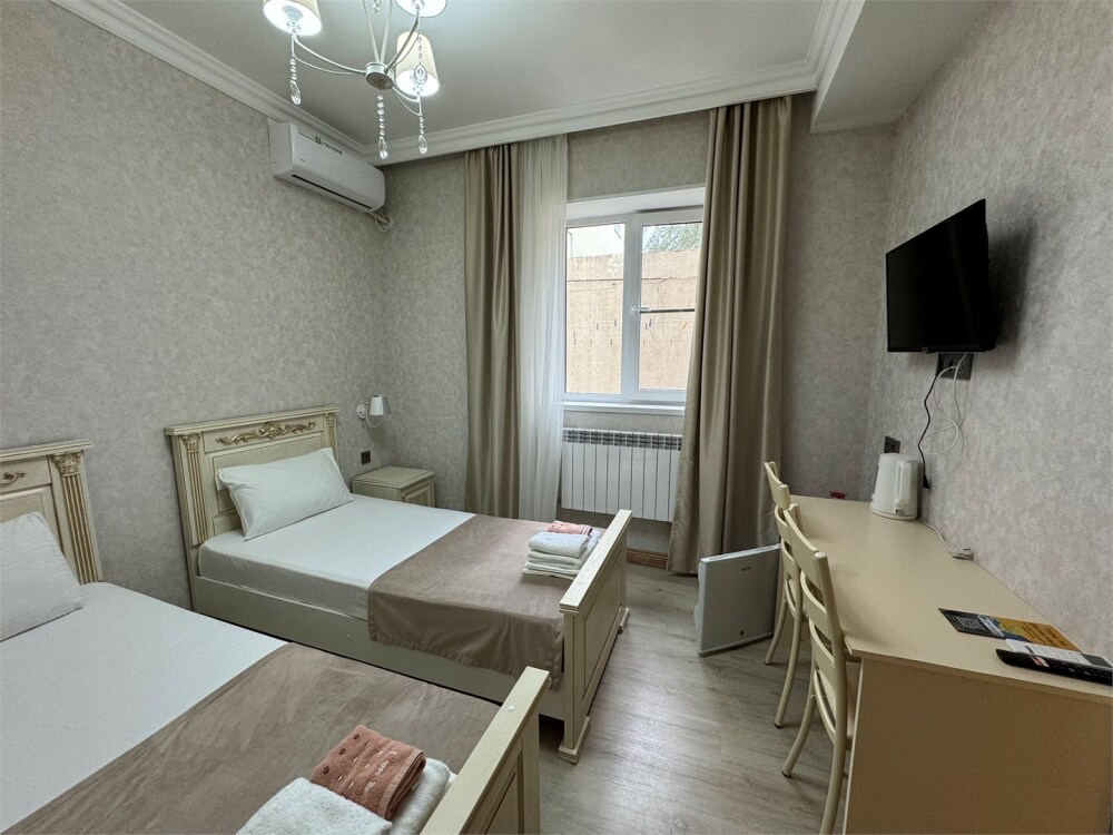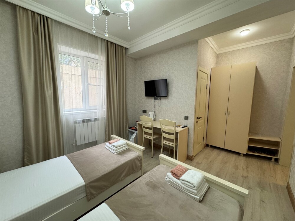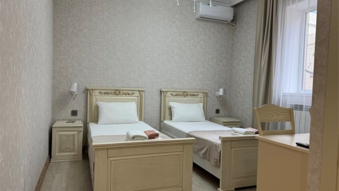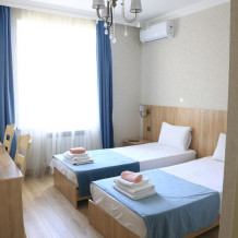 Стандартный номер на двоих с возможностью сдвинуть кровати. В номере есть всё необходимое: постельное бельё, полотенца, фен, электрочайник, телевизор и беспроводной интернет.